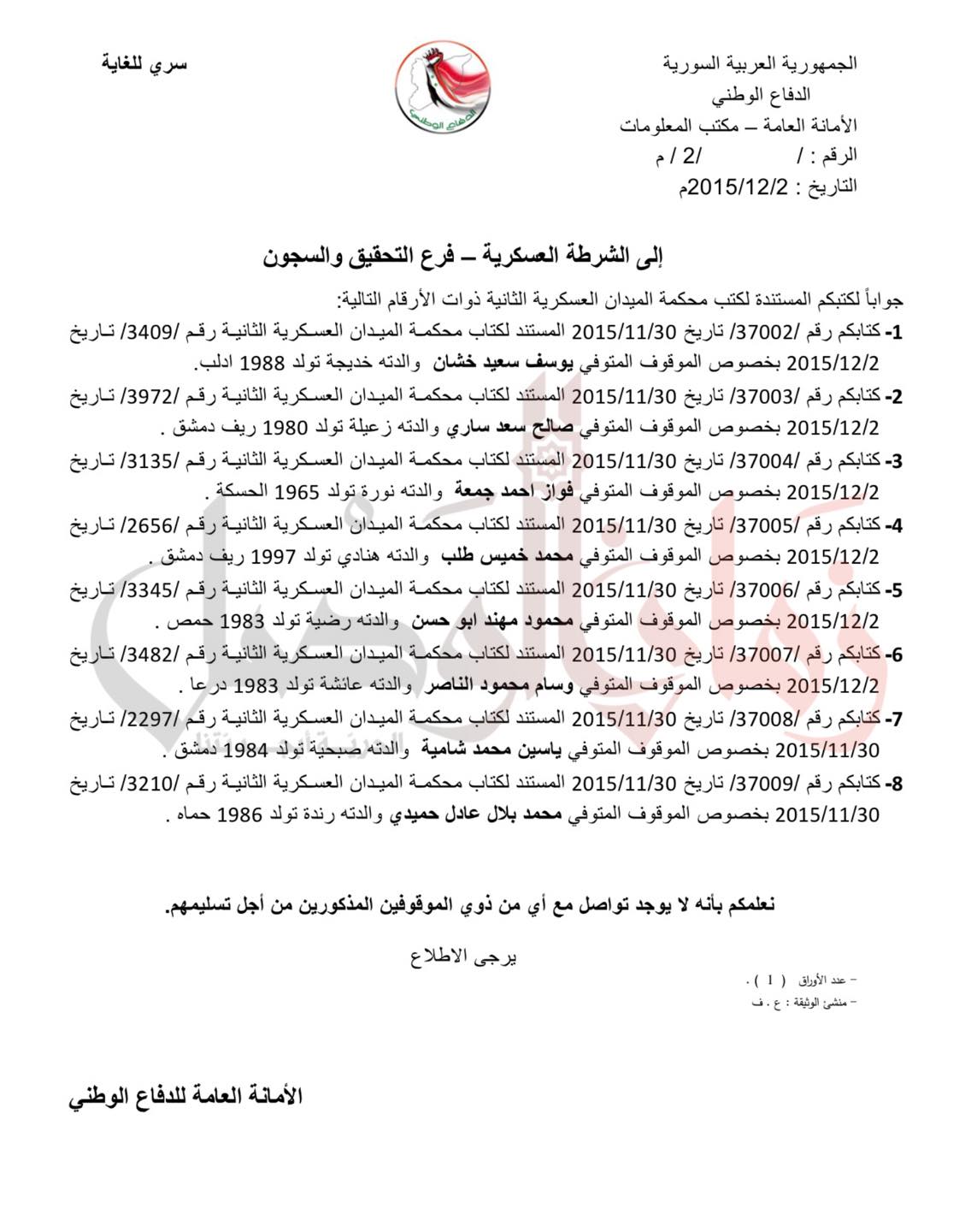كشفت برقية رسمية سورية مسربة تحمل تصنيف "سري للغاية" وصادرة عن الأمانة العامة للدفاع الوطني بتاريخ 2/12/2015 عن تفاصيل تتعلق بوفاة 8 موقوفين لديها.