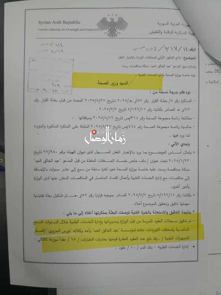 المنظمة اتفقت على تنفيذ المشروع مع شركة "المجموعة الطبية" التابعة لعبد الخالق العبد، المعروف بتورطه في عقود مزوّرة وسرقة عشرات المليارات، وفق تقرير الهيئة العامة للرقابة والتفتيش الصادر بتاريخ 18/9/2025، حتى أن وزارة الصحة السورية أوقف التعامل المالي معه حتى انتهاء التحقيق.