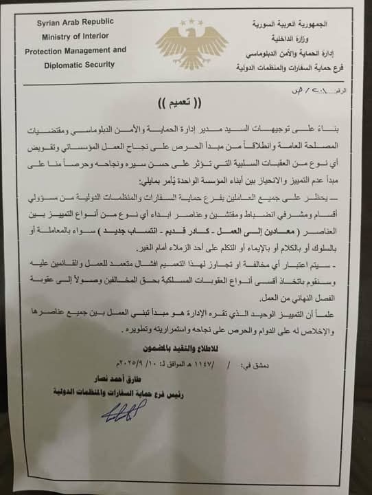 حصلت "زمان الوصل" على نسخة من تعميم صادر عن إدارة الحماية والأمن الدبلوماسي في وزارة الداخلية السورية، يتضمن تأكيدًا صارمًا على حظر جميع أشكال التمييز بين العاملين في فرع حماية السفارات والمنظمات الدولية.