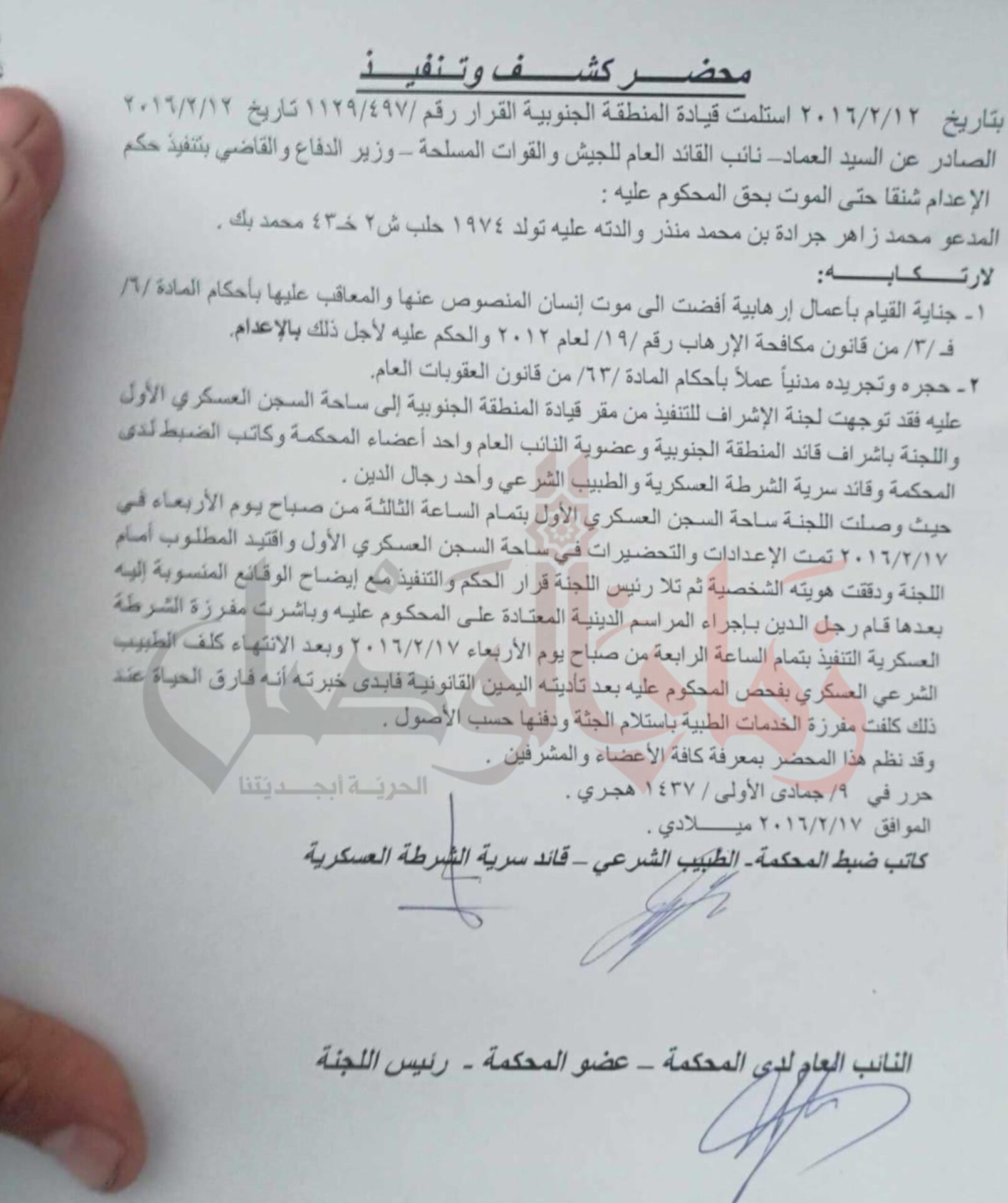 كشفت وثائق حصرية حصلت على صورها "زمان الوصل" تفاصيل صادمة لعمليات إعدام جرت داخل سجن صيدنايا العسكري شمال دمشق عام 2016.
