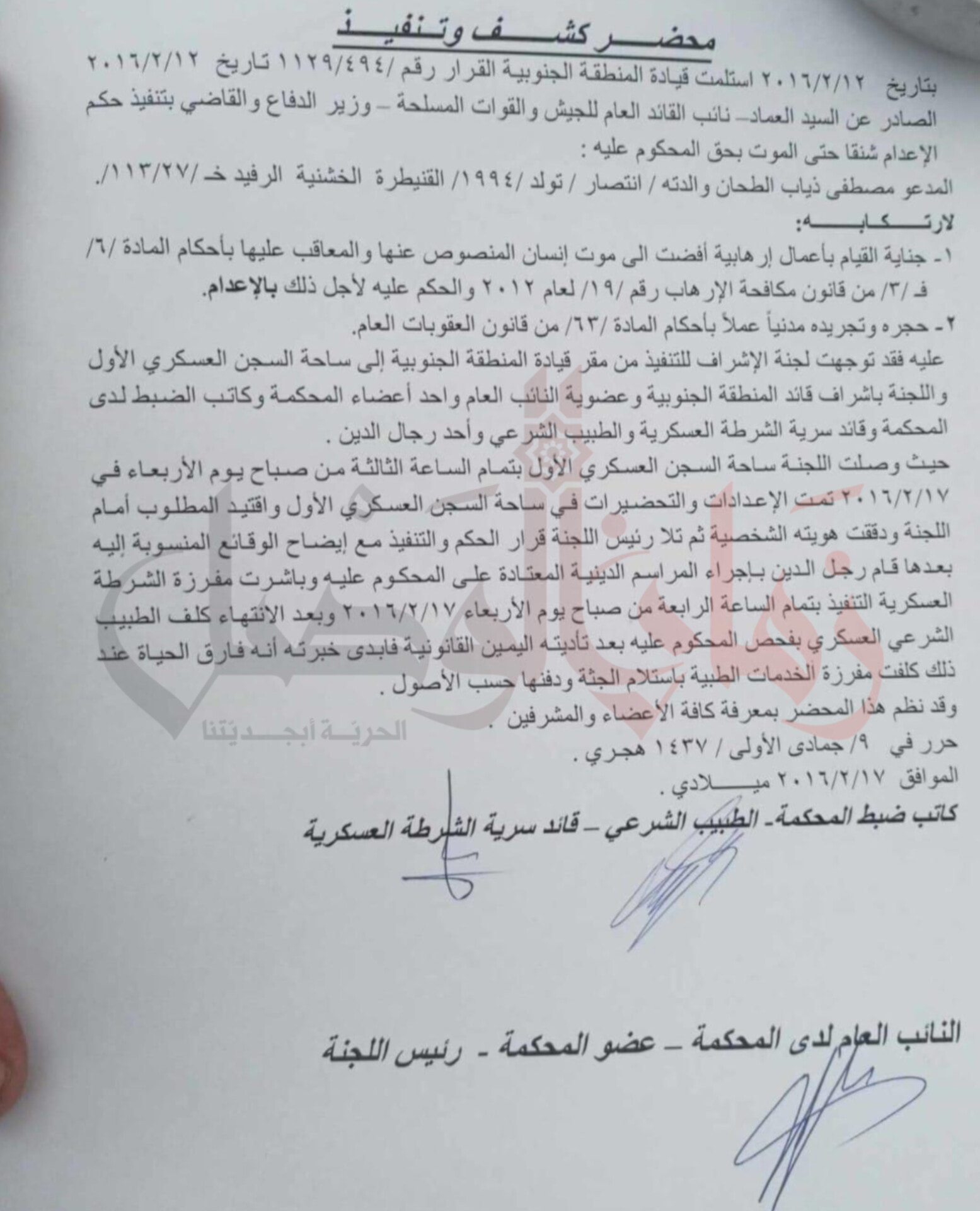 لجنة الإشراف: تشكلت لجان للإشراف على التنفيذ، ضمّت النائب العام، وعضواً من المحكمة، وكاتب الضبط، وقائد سرية الشرطة، والطبيب الشرعي (غالباً يكون اختصاصه أسنان أو تجميل!)، بل وحتى رجل دين. هذا الحضور المكثف يمثل محاولة لإضفاء طابع رسمي وديني خادع على عملية القتل.