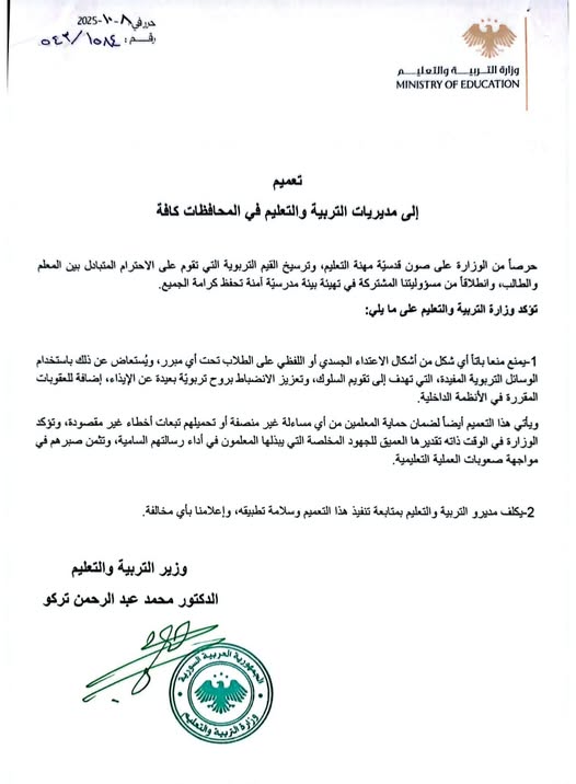 لذلك، شددت وزارة التربية والتعليم في هذا التعميم على أن الإصلاح التربوي يبدأ من ترسيخ ثقافة الحوار والاحترام داخل المدرسة، وتعزيز دور المعلم كقدوة وموجّه، وليس كمنفّذ للعقوبة.