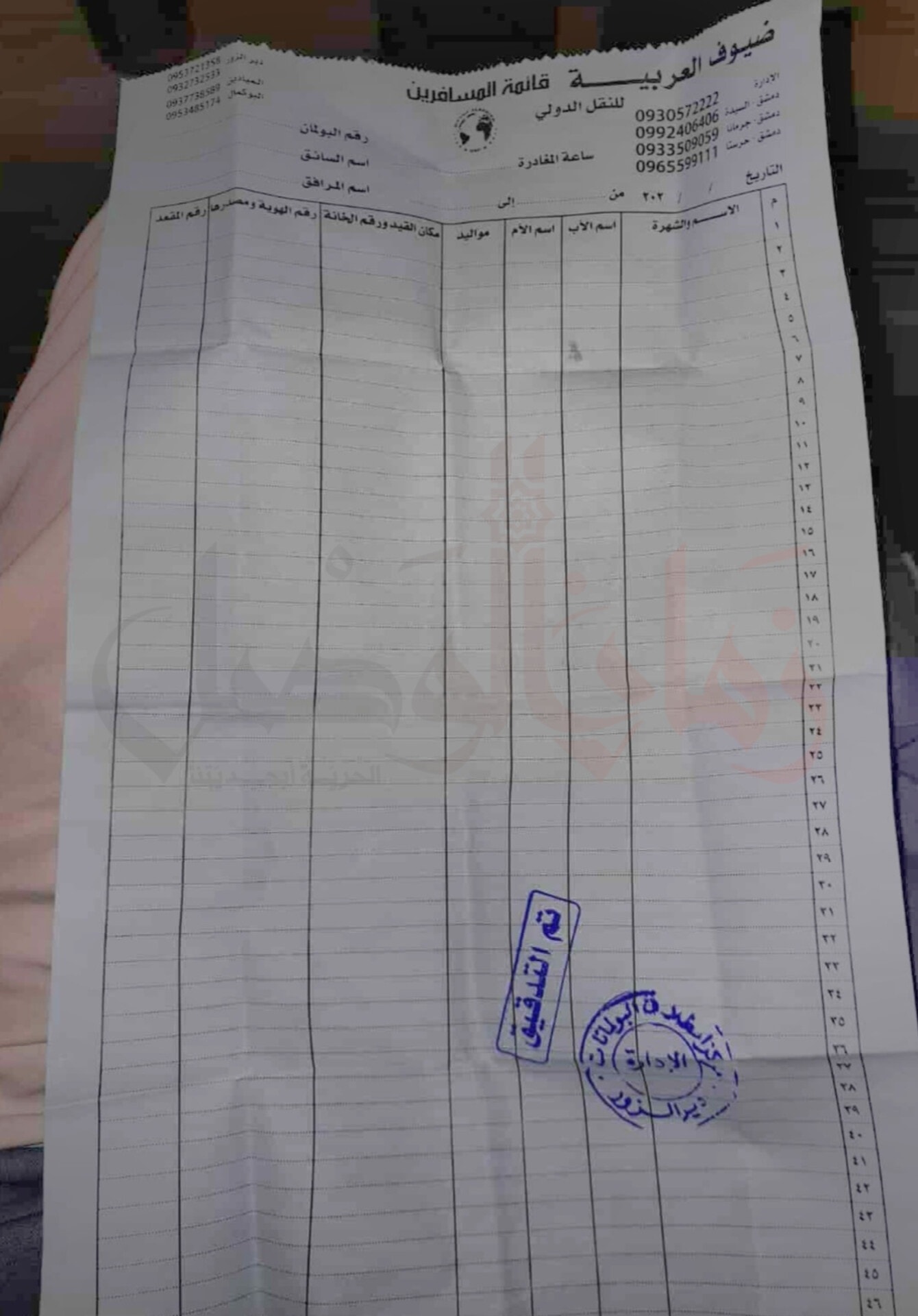 ضبط أحد عناصر حاجز البانوراما في دير الزور في 8 من الشهر الحالي، ورقة مذيلة بختم "أمن البولمان" ومركز بولمان دير الزور، كانت فارغة، داخل أحد باصات شركة "الضيوف العربية".