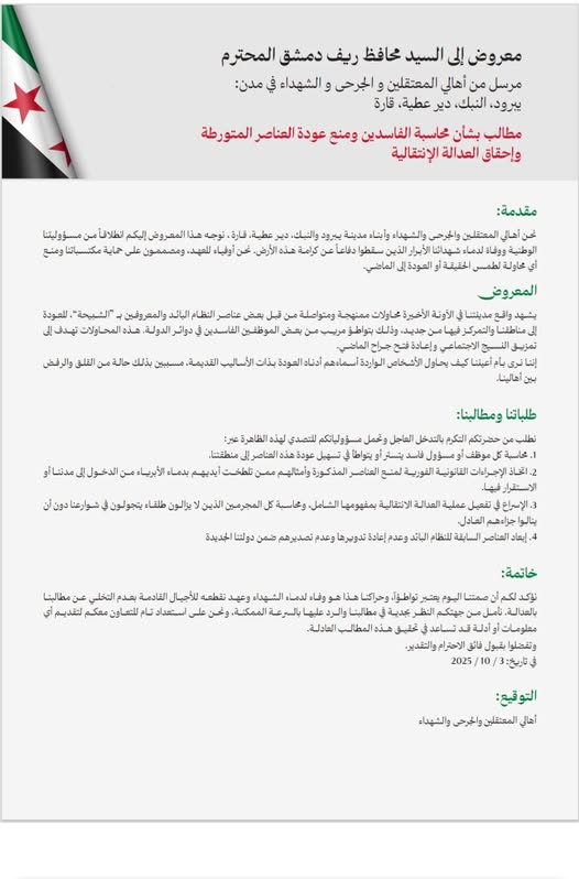 رفع عدد من أهالي المعتقلين والجرحى وذوي الشهداء في مدينة دير عطية بريف دمشق معروضًا رسميًا إلى محافظ ريف دمشق، عبّروا فيه عن رفضهم لمحاولات إعادة بعض العناصر المتورطة في الانتهاكات السابقة إلى مواقعهم أو إلى الحياة العامة، مؤكدين تمسكهم بتفعيل مبادئ العدالة الانتقالية ومحاسبة المسؤولين عن تلك الانتهاكات.
