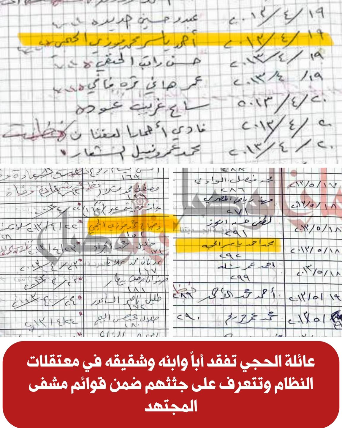 أكدت عائلة الحجي أنها تعرّفت على أسماء ثلاثة من أفرادها ضمن قوائم ضحايا التعذيب التي نشرتها صحيفة “زمان الوصل” والمتعلقة بجثث مشفى المجتهد في دمشق.
