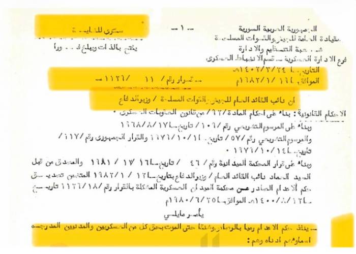 كشفت وثيقة رسمية صادرة عن القيادة العامة للجيش والقوات المسلحة السورية، شعبة التنظيم والإدارة، عن صدور أمر بتنفيذ حكم إعدام جماعي رمياً بالرصاص وشنقاً حتى الموت بحق 21 شخصاً، شمل عسكريين ومدنيين، بعد إدانتهم بتهمة "جناية الانتساب لجماعة الإخوان المسلمين الجناح المسلح".