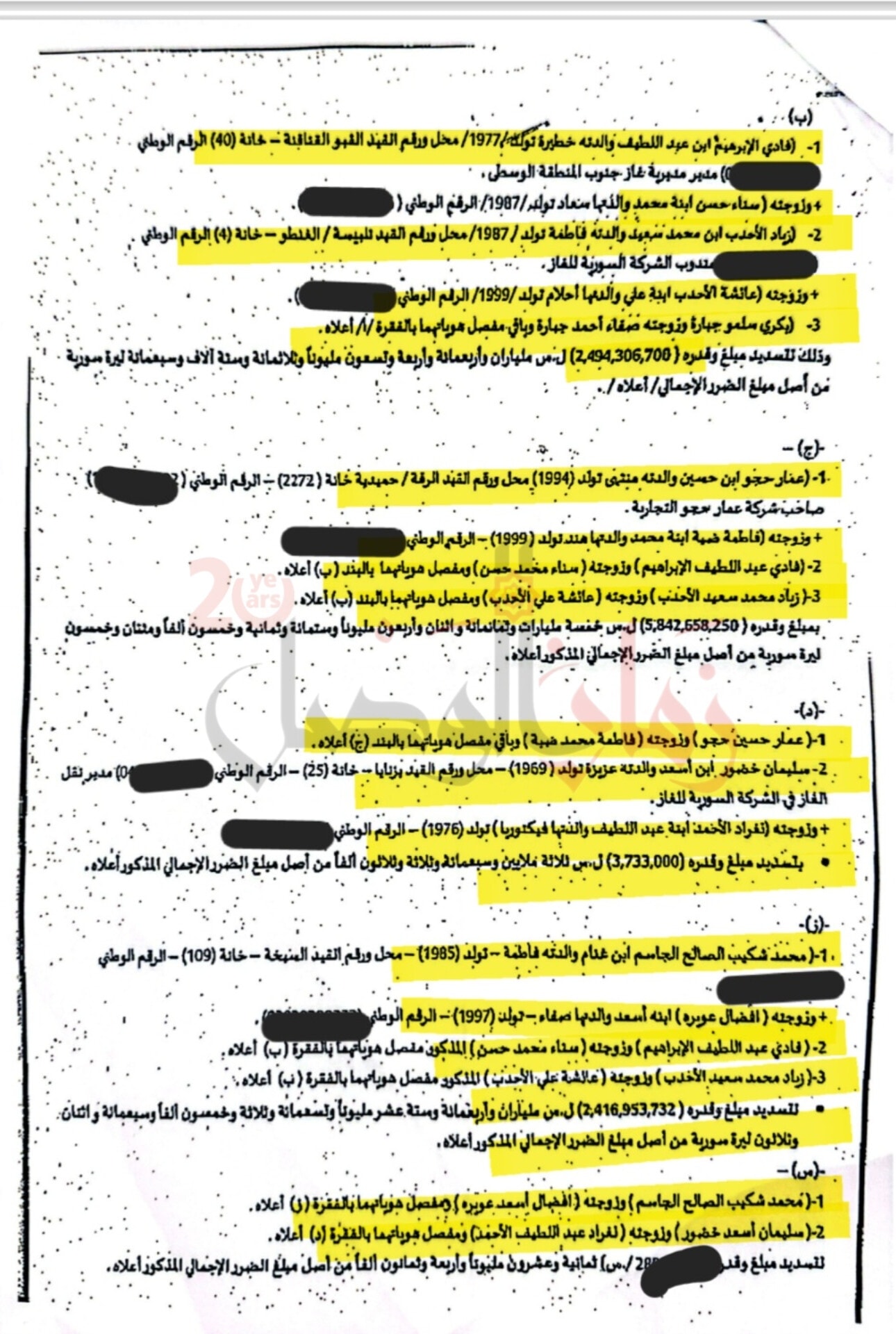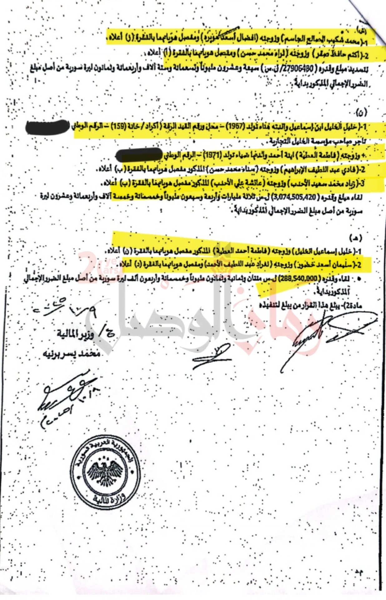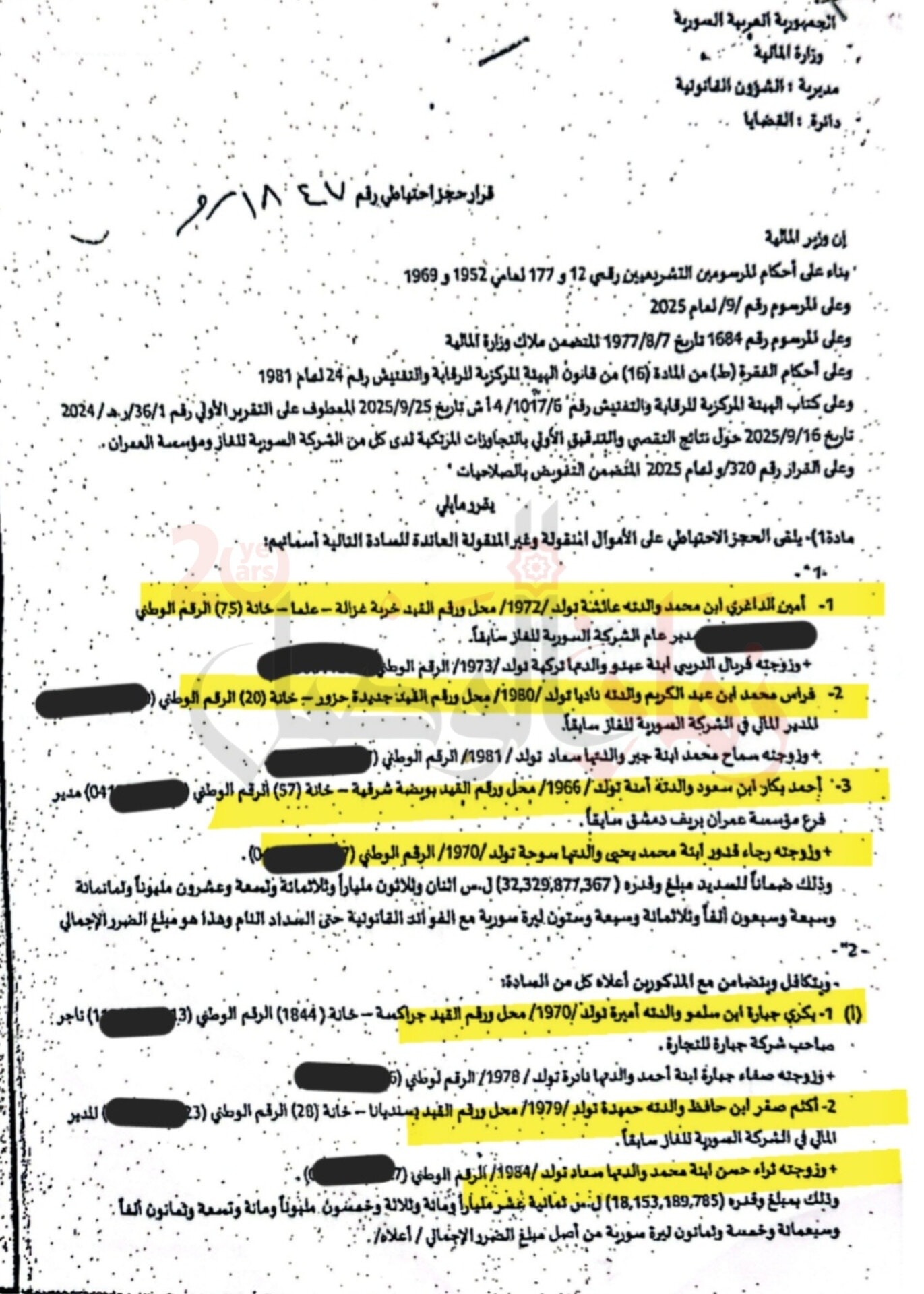 وشمل قرار الحجز أيضًا المدير المالي في الشركة السورية للغاز فراس عبدالكريم محمد، والمدير السابق لمؤسسة العمران أحمد سعود بكار وزوجته، إلى جانب مجموعة من التجار الذين وردت أسماؤهم في الوثيقة الرسمية المرفقة.