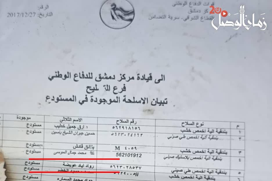 وتشير الوثائق إلى أن بسام حمود الصالح، من مواليد 9 تموز 1977، التحق بميليشيا الدفاع الوطني في حي التضامن بتاريخ 6 كانون الأول 2013، حيث تولى مهمة رامي رشاش دوشكا.