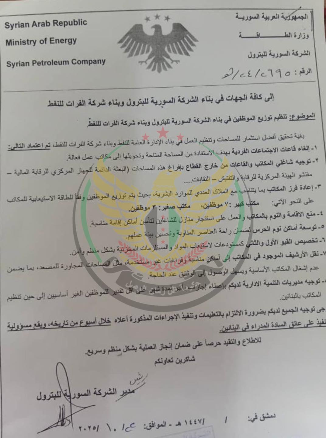 أصدر الدكتور يوسف قبلاوي، المدير العام الجديد للشركة السورية للبترول، أول قرار رسمي له يتضمن خطة واسعة لإعادة هيكلة وتنظيم مقري الشركة في دمشق، وذلك بهدف "تحقيق أفضل استثمار للمساحات المتاحة".