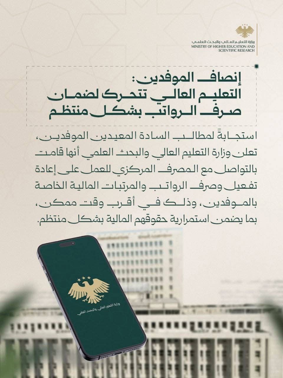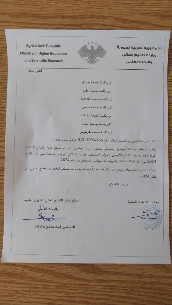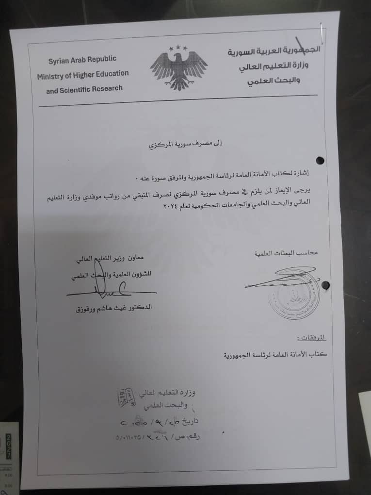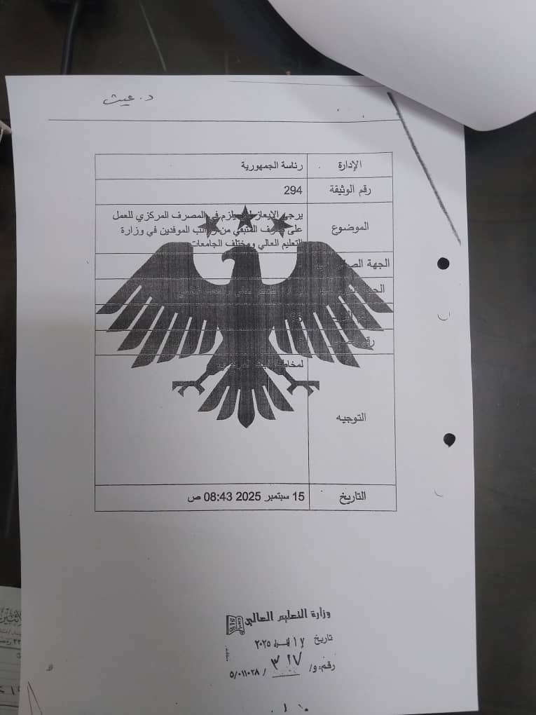 ولتحقيق ذلك، قامت الوزارة بإرسال كتاب رسمي إلى الجامعات والمصرف المركزي حثّت فيه على اتخاذ الإجراءات اللازمة لتنفيذ التوجيهات. ومع ذلك، لم تترجم هذه الخطوات إلى نتائج ملموسة على أرض الواقع، حيث لم يصرف أي من المستحقات حتى تاريخه، مما يعني استمرار تأخر الصرف لأشهر إضافية.