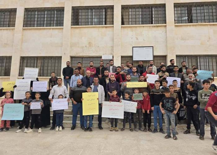 شهدت بلدة إبين سمعان بريف حلب الغربي وقفة احتجاجية سلمية شارك فيها عدد من الكوادر الإدارية والتدريسية، عبّروا خلالها عن استيائهم من تدنّي الرواتب وغياب الكتب والمستلزمات التعليمية في مدارس المنطقة.