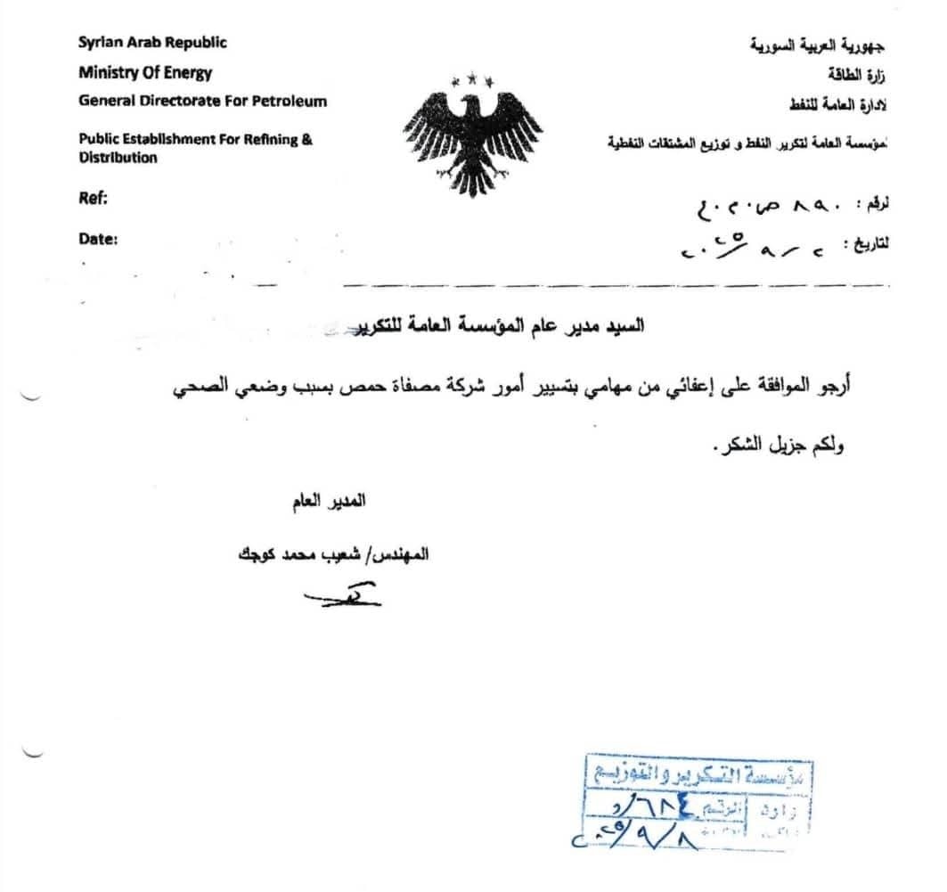 أصدر المدير العام للمؤسسة العامة للتكرير، المهندس طارق شلاش العبدالله، توضيحاً بشأن ما تم تداوله حول إعفاء الأستاذ شعيب كوجك من إدارة مصفاة حمص.