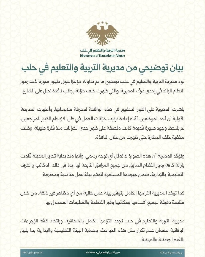 أصدرت مديرية التربية في محافظة حلب توضيحًا رسميًا عقب تداول صورة على مواقع التواصل الاجتماعي تُظهر أحد رموز النظام البائد معلّقة داخل إحدى غرف المديرية، الأمر الذي أثار تساؤلات وانتقادات واسعة بين المتابعين حول ملابسات ظهورها.