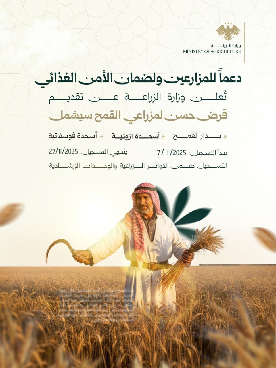 وبحسب بيان الوزارة، يتضمن القرض تقديم بذار قمح معتمدة إضافة إلى أسمدة آزوتية وفوسفاتية، وذلك وفق آلية تهدف إلى تمكين المزارعين من بدء الموسم الزراعي بكفاءة أعلى وتقليل الأعباء المادية عليهم.