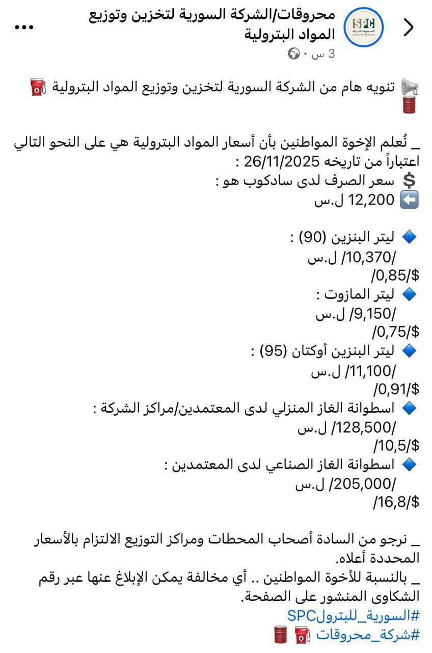 أثارت تسعيرة المشتقات النفطية الأخيرة الصادرة عن شركة "محروقات" عاصفة من التساؤلات، حيث اعتمدت الشركة سعر صرف للدولار يقترب من 12,200 ليرة سورية.