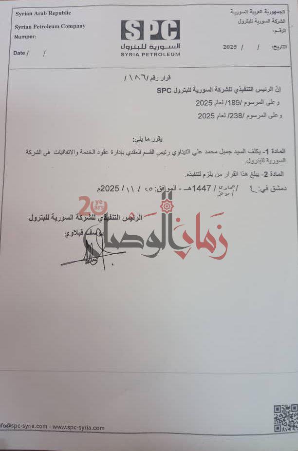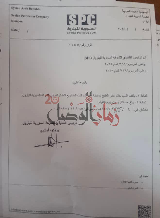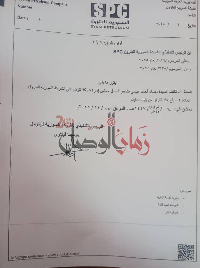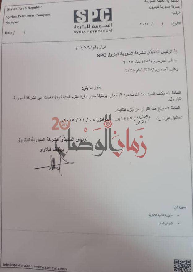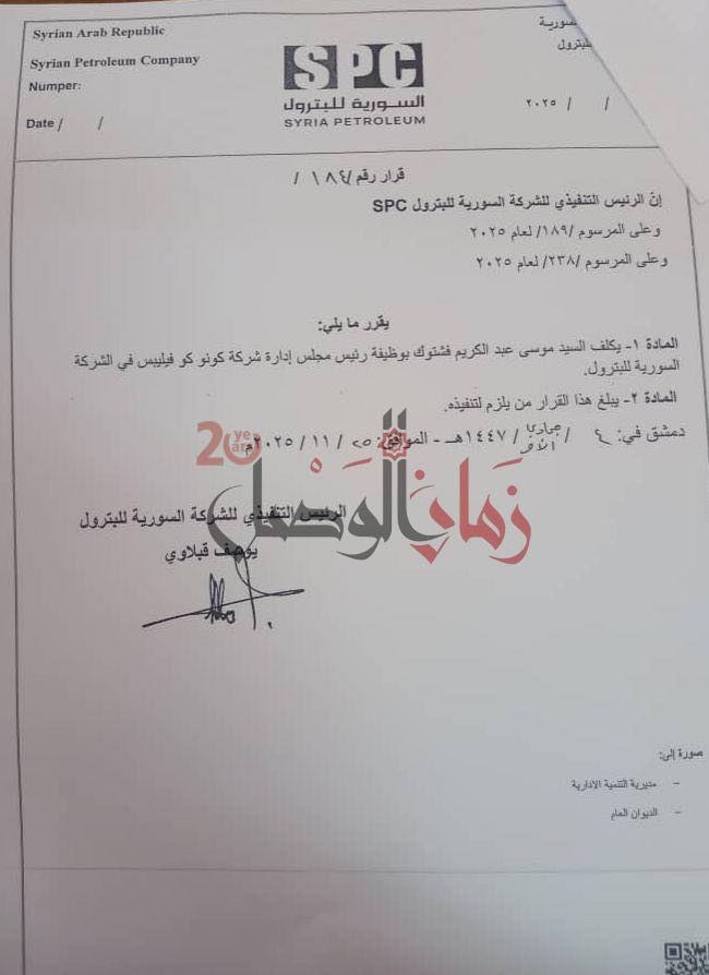 شهدت الشركة السورية للنفط (SPC)، في دفعة واحدة من القرارات الإدارية، إطلاق حزمة من التعيينات الجديدة في مناصب قيادية وإشرافية هامة، وذلك بموجب صلاحيات الرئيس التنفيذي للشركة، يوسف قبلاوي.