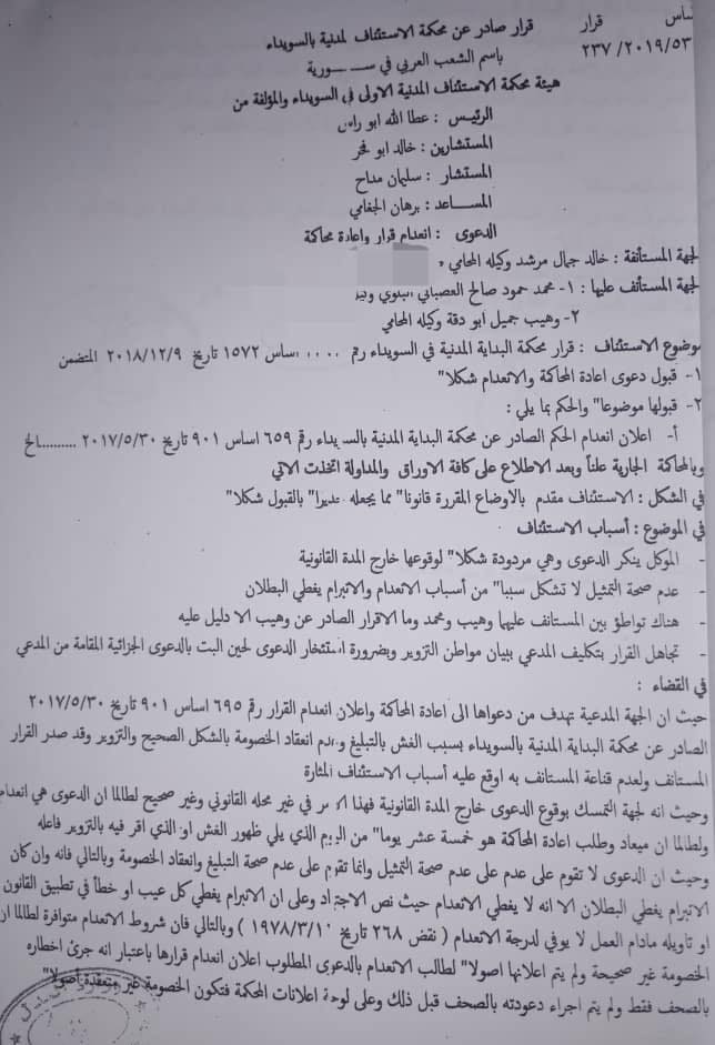 ومن بين هذه القضايا قضية عقار مملوك للمواطن السعودي محمد حمود صالح العصباني البلوي في مدينة السويداء - دوار الباسل سابقاً.