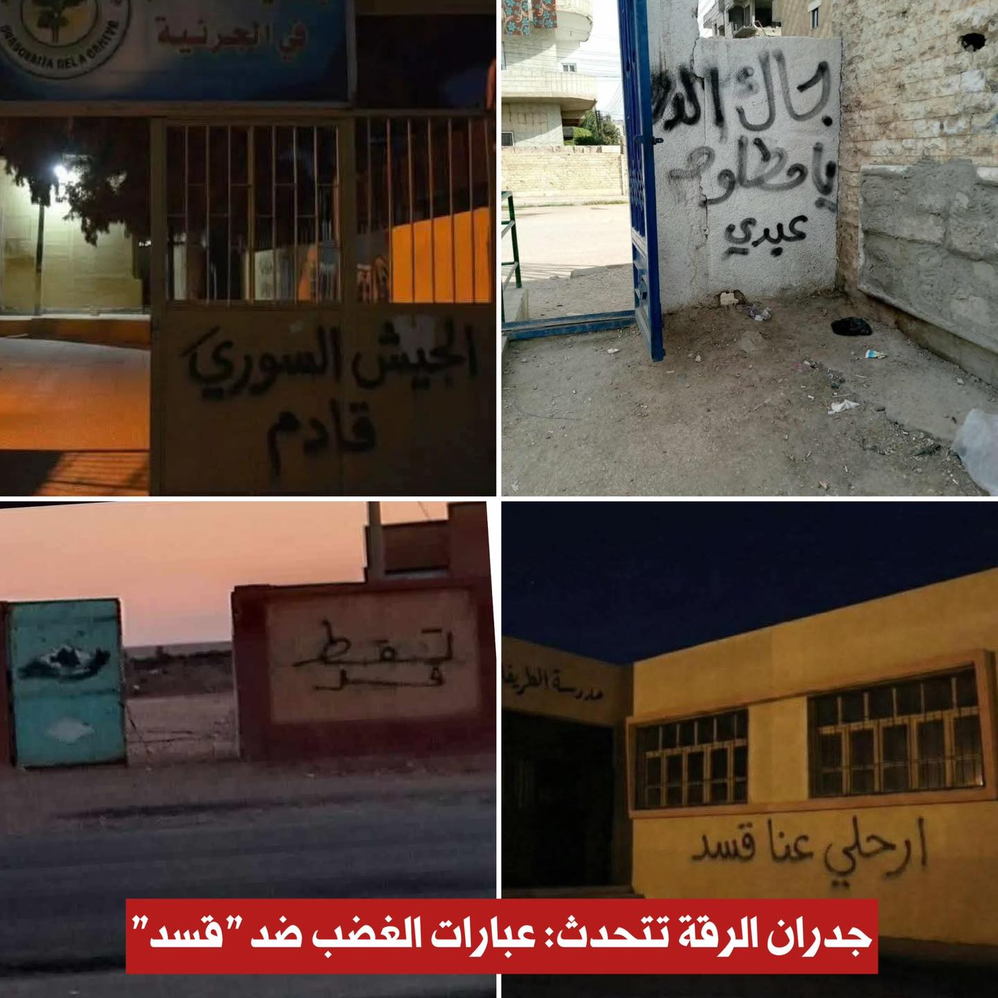 في تطور لافت، بدأت مدينة الرقة تشهد ملامح انتفاضة شعبية جديدة ضد قوات سوريا الديمقراطية ("قسد")، حيث انتشرت خلال الأربع والعشرين ساعة الماضية عبارات مناهضة لسلطات "قسد" على جدران العديد من المباني العامة في المدينة وريفها. هذه الحركات التصعيدية تذكّر ببداية الثورة السورية، حين كانت الكتابات على الجدران أداة للتعبير عن الرفض والاحتجاج.
