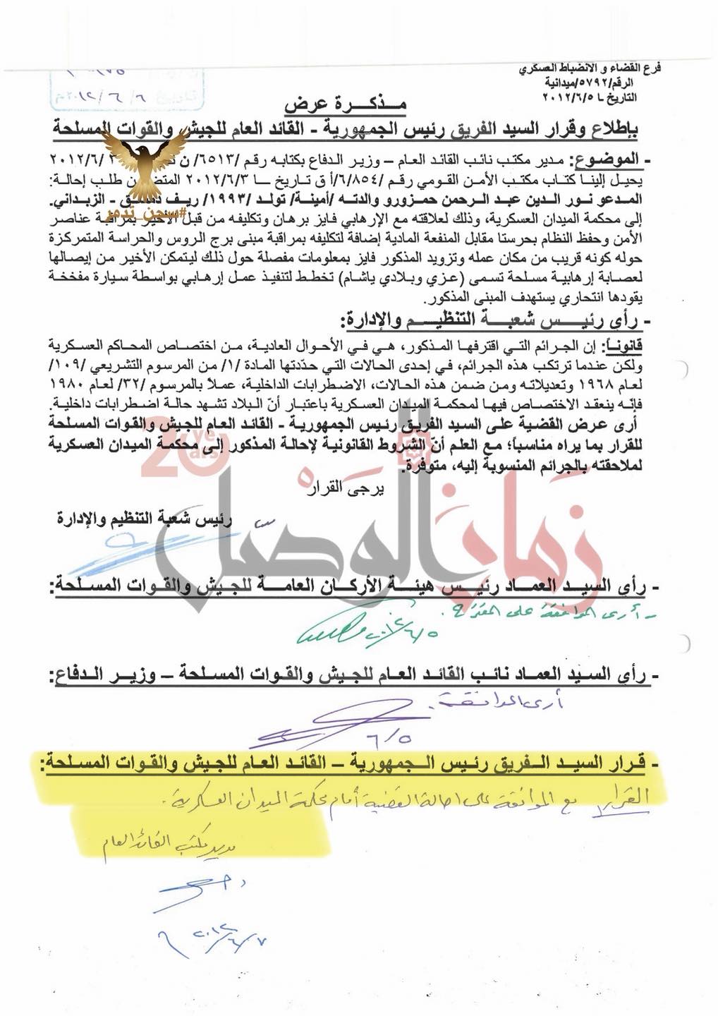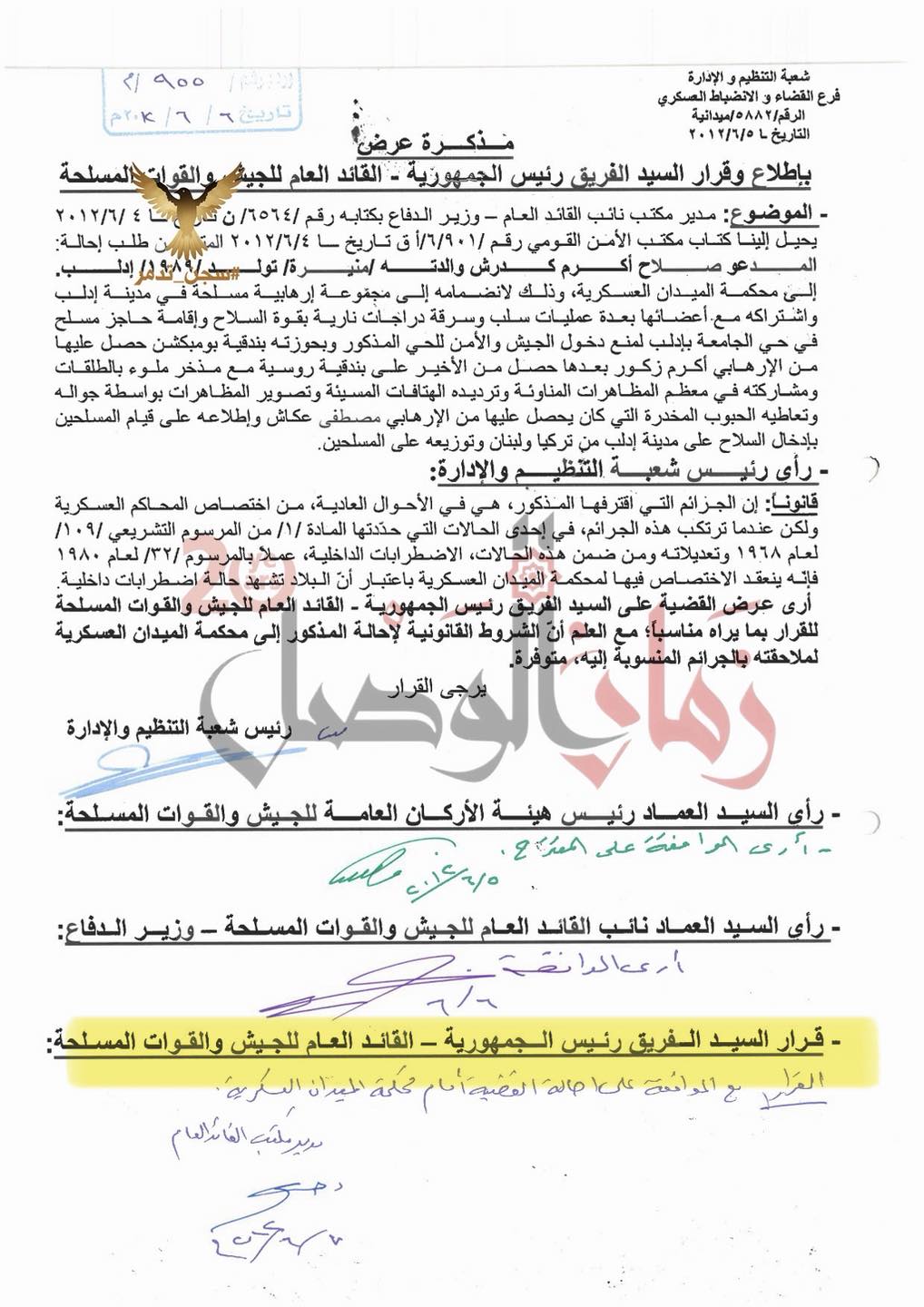 في السابع من حزيران (يونيو) عام 2012، وفي يوم واحد، وقَّع مكتب بشار الأسد على عشرات قرارات إحالة المنشقين إلى محكمة الميدان، حيث أُعدِم أغلبهم رميًا بالرصاص.