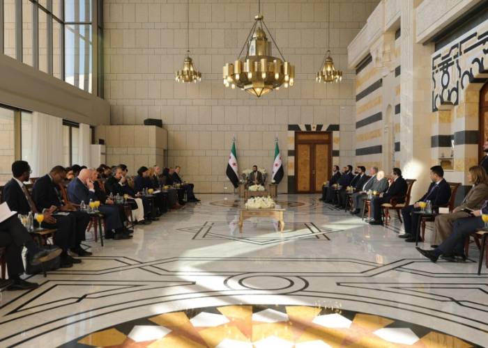 استقبل الرئيس أحمد الشرع، اليوم الخميس، في قصر الشعب وفد أعضاء مجلس الأمن الدولي التابع للأمم المتحدة، يرافقهم عدد من المسؤولين الأمميين، وبحضور عدد من الوزراء في الحكومة السورية.