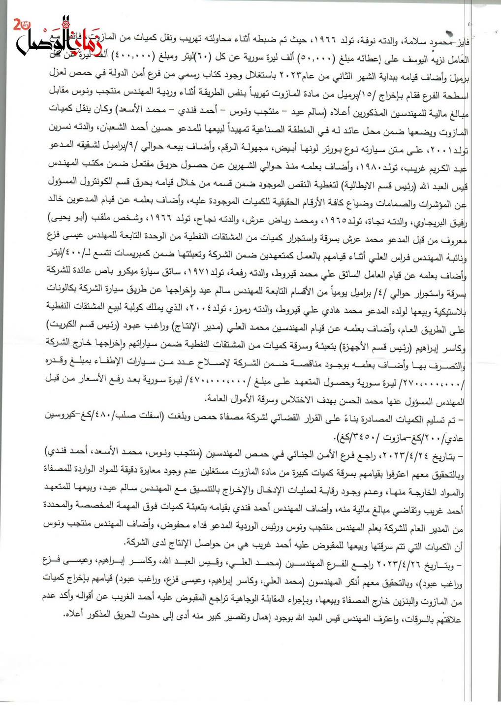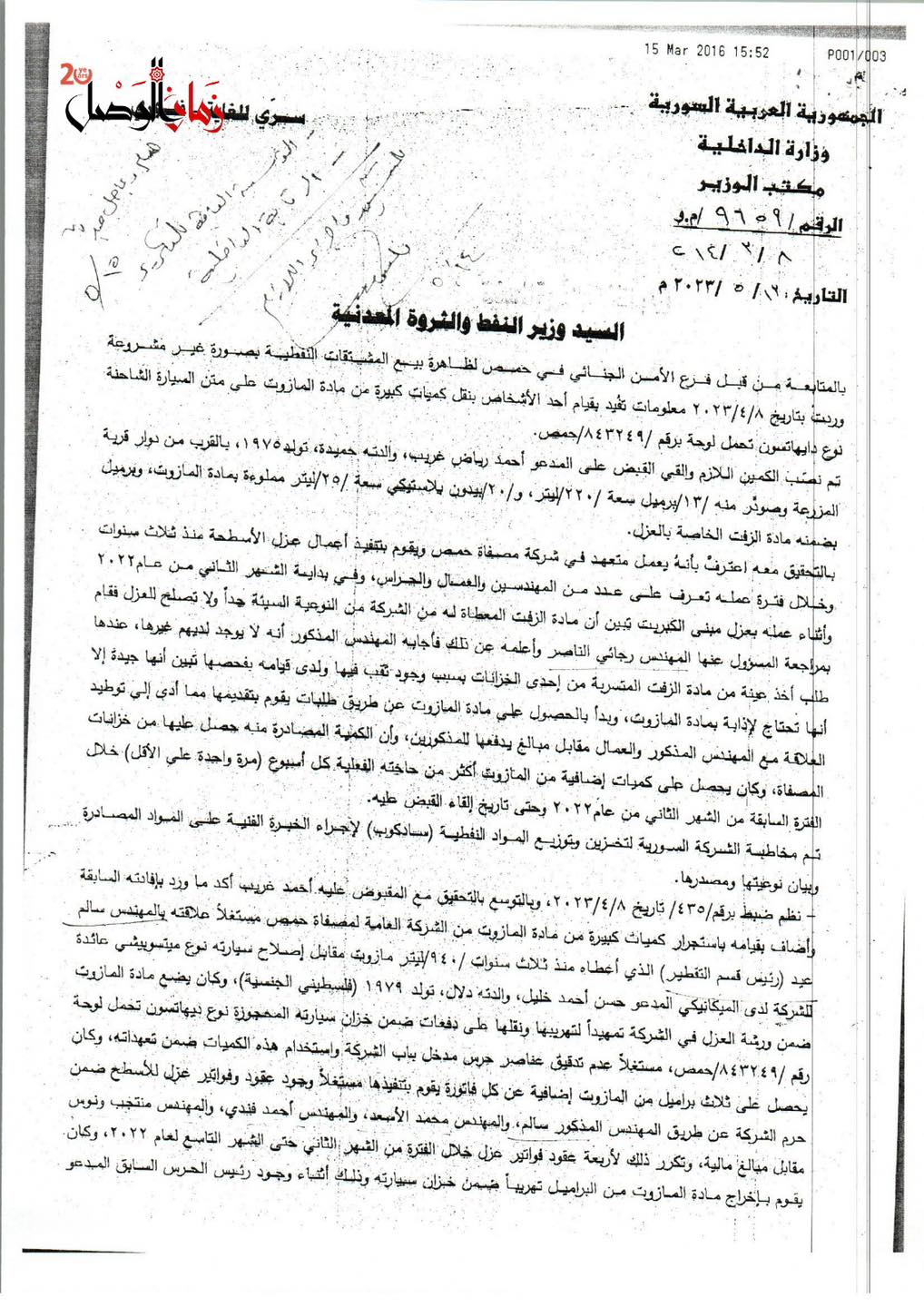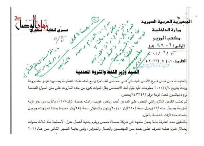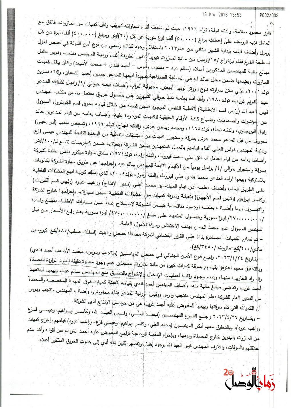 وثائق حصلت عليها "زمان الوصل" توضح كيف كانت تُهرَّب المشتقات النفطية بإشراف سالم عيد، رئيس قسم الإنتاج في المصفاة، الذي هرب من سجن عدرا يوم التحرير حيث أدين بتهريب مئات الآلاف من لترات المازوت مع مادة (VGO).