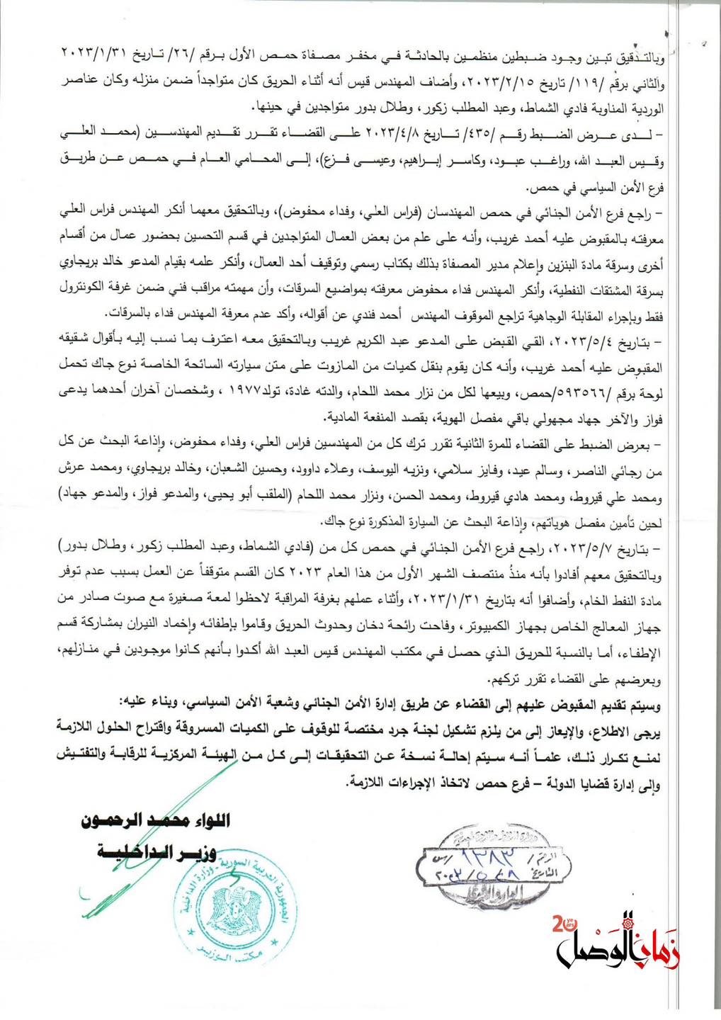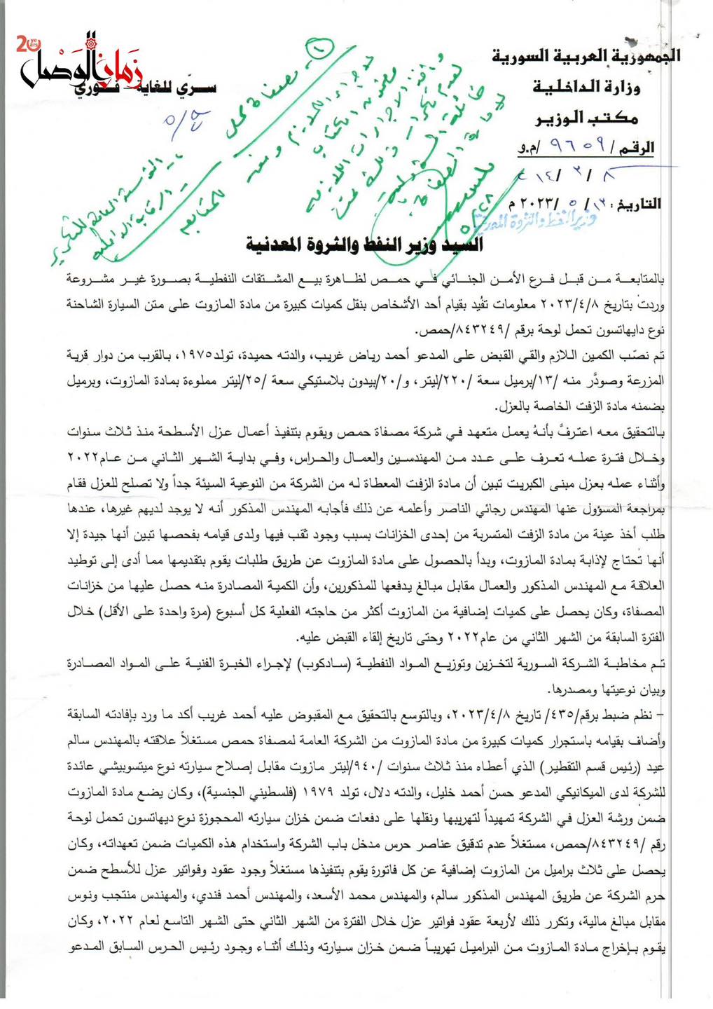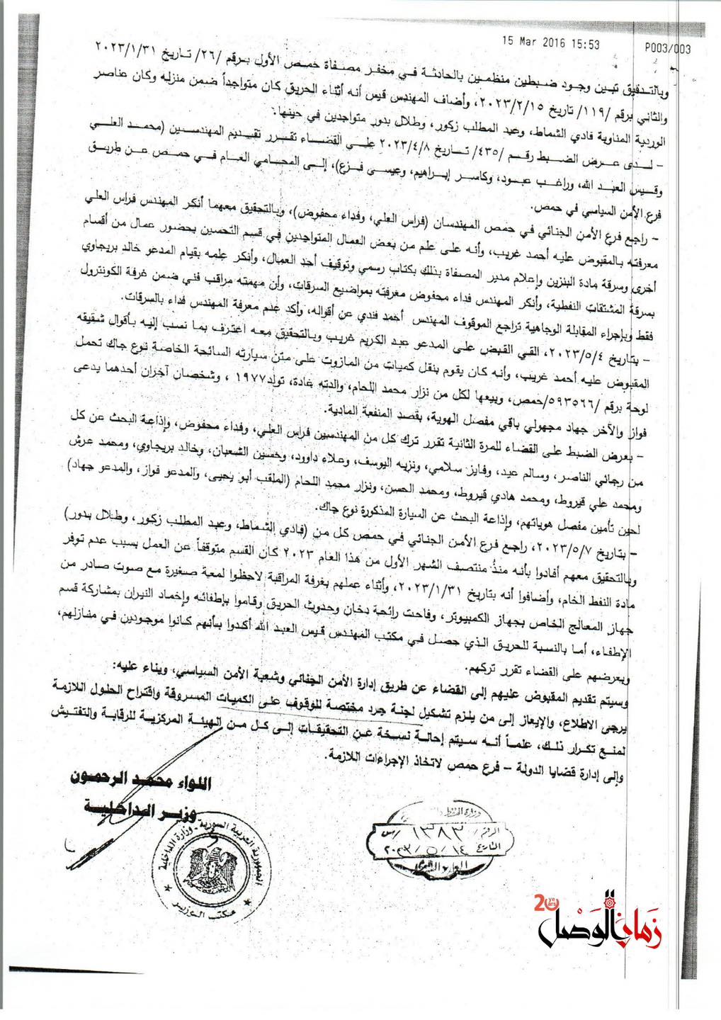 وثائق حصلت عليها "زمان الوصل" توضح كيف كانت تُهرَّب المشتقات النفطية بإشراف سالم عيد، رئيس قسم الإنتاج في المصفاة، الذي هرب من سجن عدرا يوم التحرير حيث أدين بتهريب مئات الآلاف من لترات المازوت مع مادة (VGO).