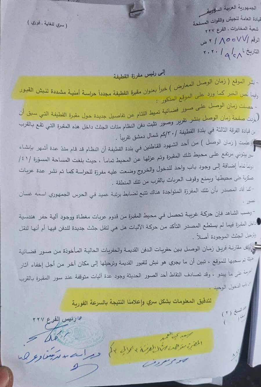نشرت "زمان الوصل" وثيقة أمنية "سري للغاية" صادرة بتاريخ 28 أيلول/سبتمبر 2020، تكشف استنفار مخابرات النظام بعد تحقيقها عن مقبرة القطيفة التي تضم دفناً جماعياً.