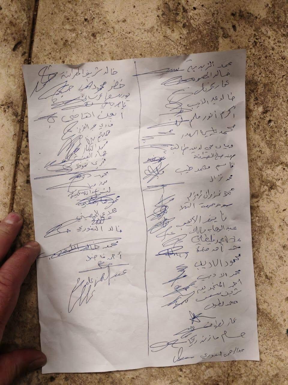 كما قام المعتصمون بجمع توقيعات الأهالي على عريضة رسمية تحمل المطالب المذكورة، تعبيراً عن موقفهم الموحد.