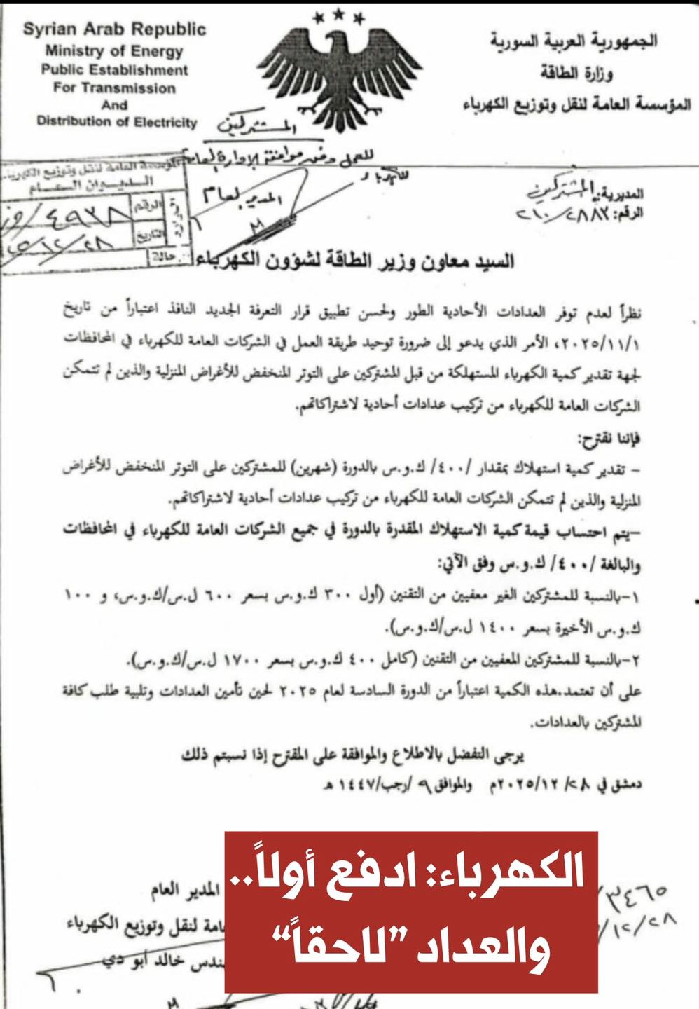 أصدرت وزارة الطاقة السورية قراراً يُلزم المشتركين المنزليين الجدد والعائدين إلى منازلهم بدفع فاتورة كهرباء تقديرية ثابتة (400 ك.و.س/شهرين) بسبب "عدم توفر العدادات".