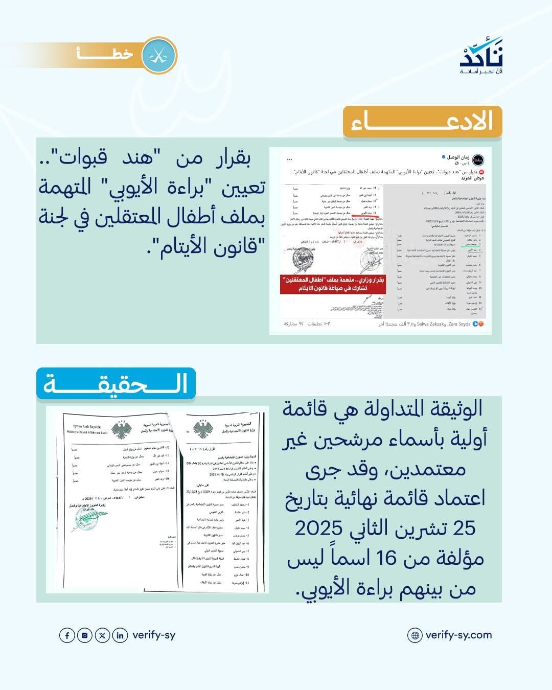 في محاولة للالتفاف على الوقائع الإدارية، نشرت منصة "تأكد" تقريراً يزعم أن الوثيقة التي كشفت عنها "زمان الوصل" بخصوص تعيين "براءة الأيوبي" في لجنة صياغة "قانون الأيتام" لم تكن سوى "مقترح أولي" جرى تغييره لاحقاً.