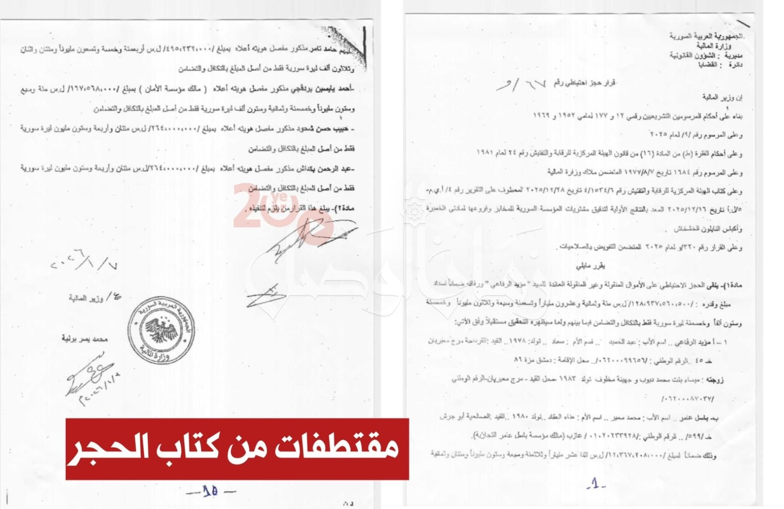 أصدر وزير المالية، الدكتور محمد يسر برنية، قرارا لعام 2026، قاضي بإلقاء الحجز الاحتياطي على الأموال المنقولة وغير المنقولة العائدة لـ"مؤيد الرفاعي" مدير فرع "الشركة العامة للمخابز الآلية" في ريف السابق، المنحدر من القرداحة في اللاذقية، ومجموعة كبيرة من شركائه وزوجاتهم. يأتي هذا الإجراء ضماناً لتحصيل مبالغ ضخمة تتجاوز 128 مليار ليرة سورية، وذلك في سياق تحقيقات تتعلق بمخالفات في مشتريات المؤسسة السورية للمخابز قبل التحرير.