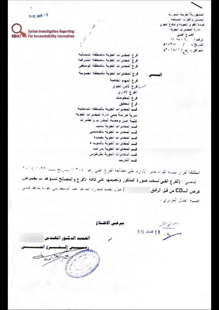 ما كان من اجهزة الامن السورية وقتها إلا التحرك مباشرة لتتبع هذا الشاهد. إذ تحرك على الفور "الفرع الفني" في ادارة المخابرات الجوية، بقيادة رئيس الفرع العميد معين قاسم، وذلك بتاريخ 23 كانون الأول/ ديسمبر وأرسل معلومات وصورا واربع لقطات شاشة مباشرة من تلفزيون الجديد لوجه الشاهد، مع تسجيل صوتي كامل لِمداخلته، وذلك مرفقاً مع مذكرة "مطالعة" موجهة لـ19 فرع أمني في سوريا حيث تم تعميم صورة الشاهد وصوته على قرص ليزري وذلك للتعرف عليه.