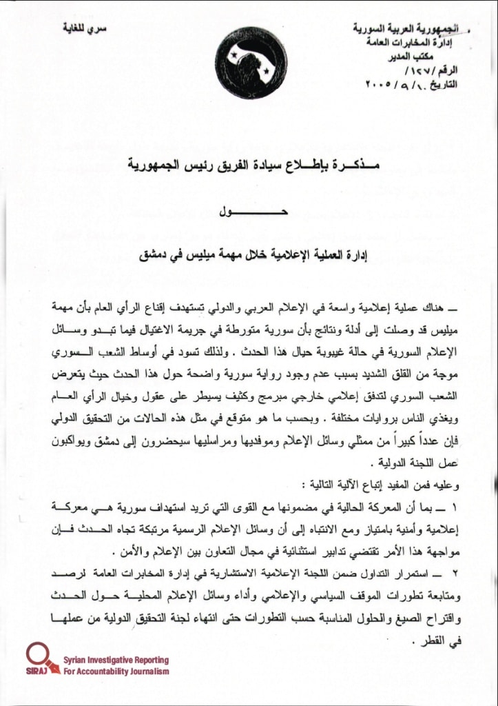 إذ بعد أسبوع من تصريح ميليس، أرسلت إدارة المخابرات العامة إلى بشار الأسد مسودة مذكرة التفاهم بين سوريا والأمم المتحدة حول التحقيق في اغتيال الحريري، والقرار 1595. وفي 10 أيلول/سبتمبر 2005، أرسلت مذكرة أخرى من المخابرات العامة إلى بشار الأسد، حول "إدارة العملية الإعلامية خلال مهمة ميليس في دمشق".