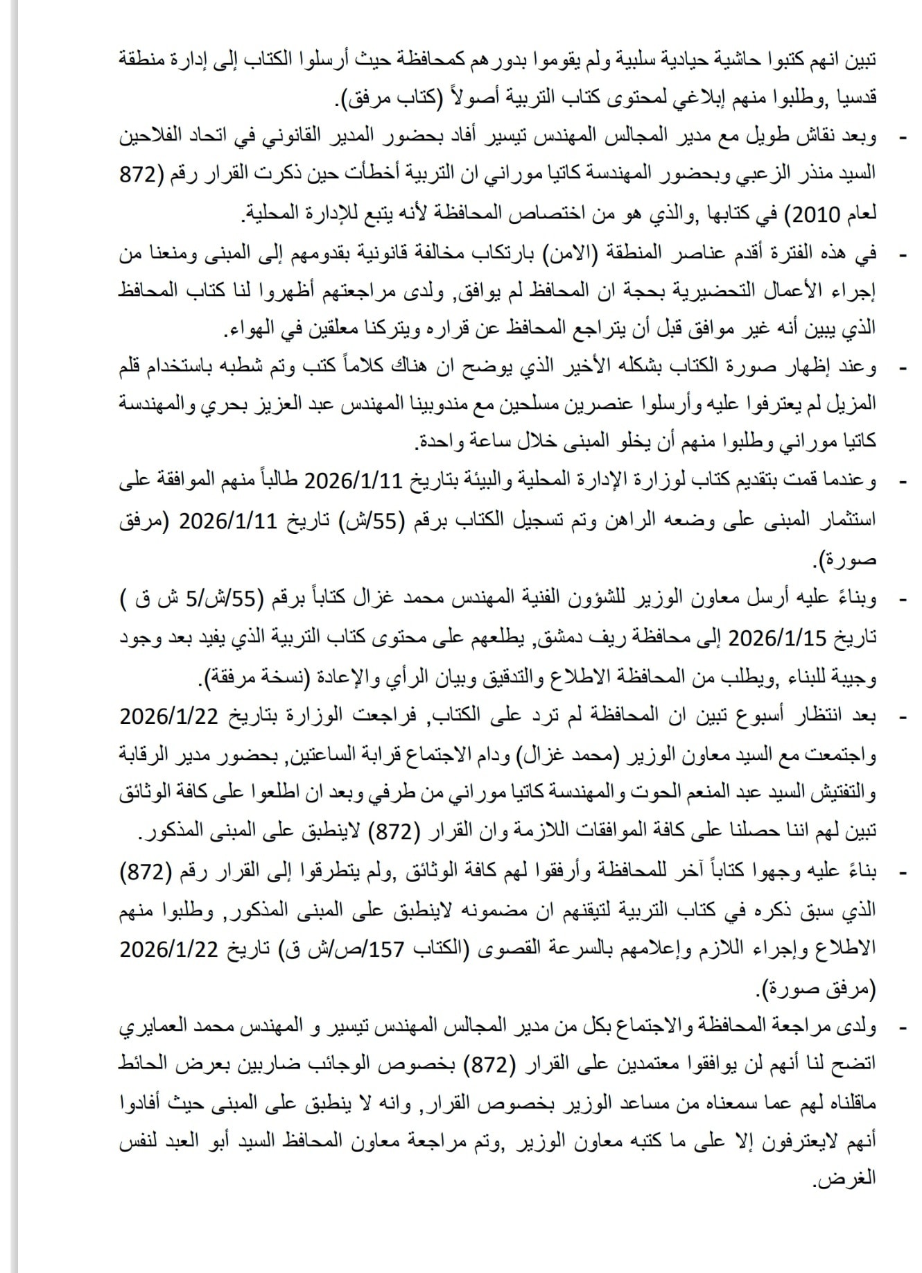 ​نقطة الخلاف الجوهرية تركزت حول "القرار 872 لعام 2010" المتعلق بالوجائب العمرانية؛ فبينما أكد معاون وزير الإدارة المحلية المهندس محمد غزال في اجتماعات رسمية وثقها المستثمر أن القرار لا ينطبق على حالة المبنى الراهنة، أصرت مديرية المجالس في المحافظة على التمسك به كذريعة لرفض الترخيص، مما وضع المستثمر في حلقة مفرغة بين الوزارة (الجهة المشرفة) والمحافظة (الجهة التنفيذية).