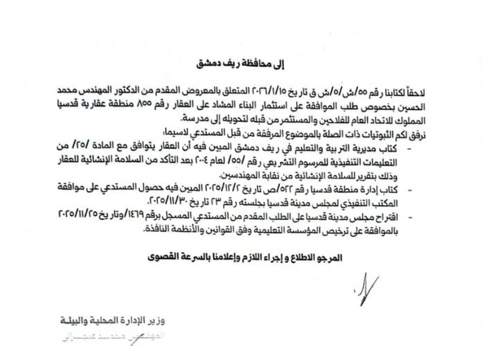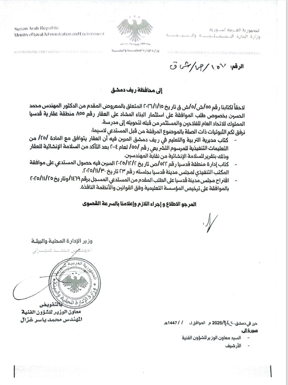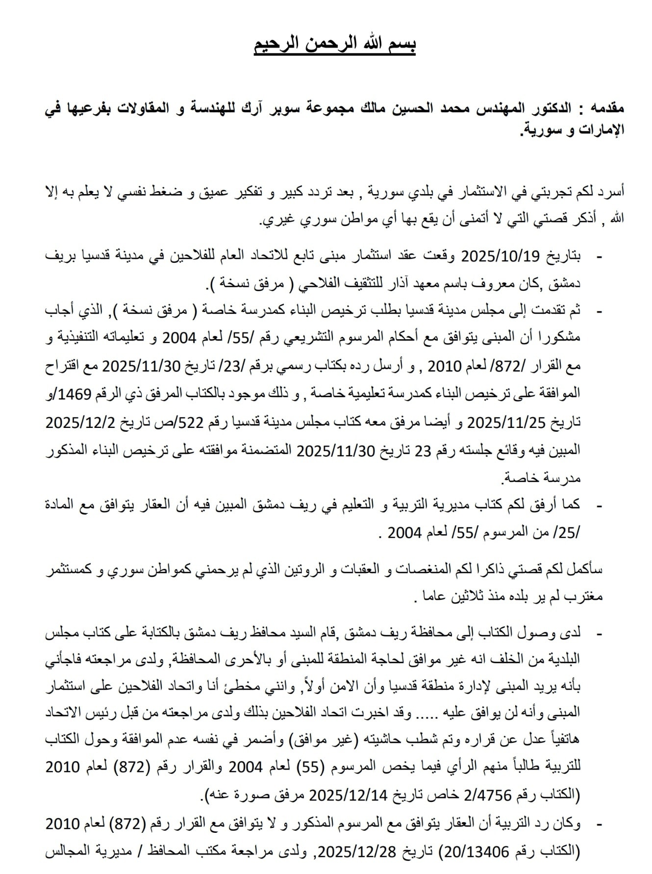 ​بدأت الحكاية بتاريخ 19/10/2025، حين وقع الدكتور الحسين عقد استثمار لمبنى "معهد آذار للتثقيف الفلاحي" التابع للاتحاد العام للفلاحين في قدسيا، بهدف تحويله إلى مدرسة خاصة. المشروع حصل في بدايته على "الضوء الأخضر" من مجلس مدينة قدسيا والكتاب الرسمي رقم (23) تاريخ 30/11/2025، الذي أكد توافق المبنى مع المرسوم التشريعي رقم (55) لعام 2004 المنظم للمؤسسات التعليمية الخاصة.