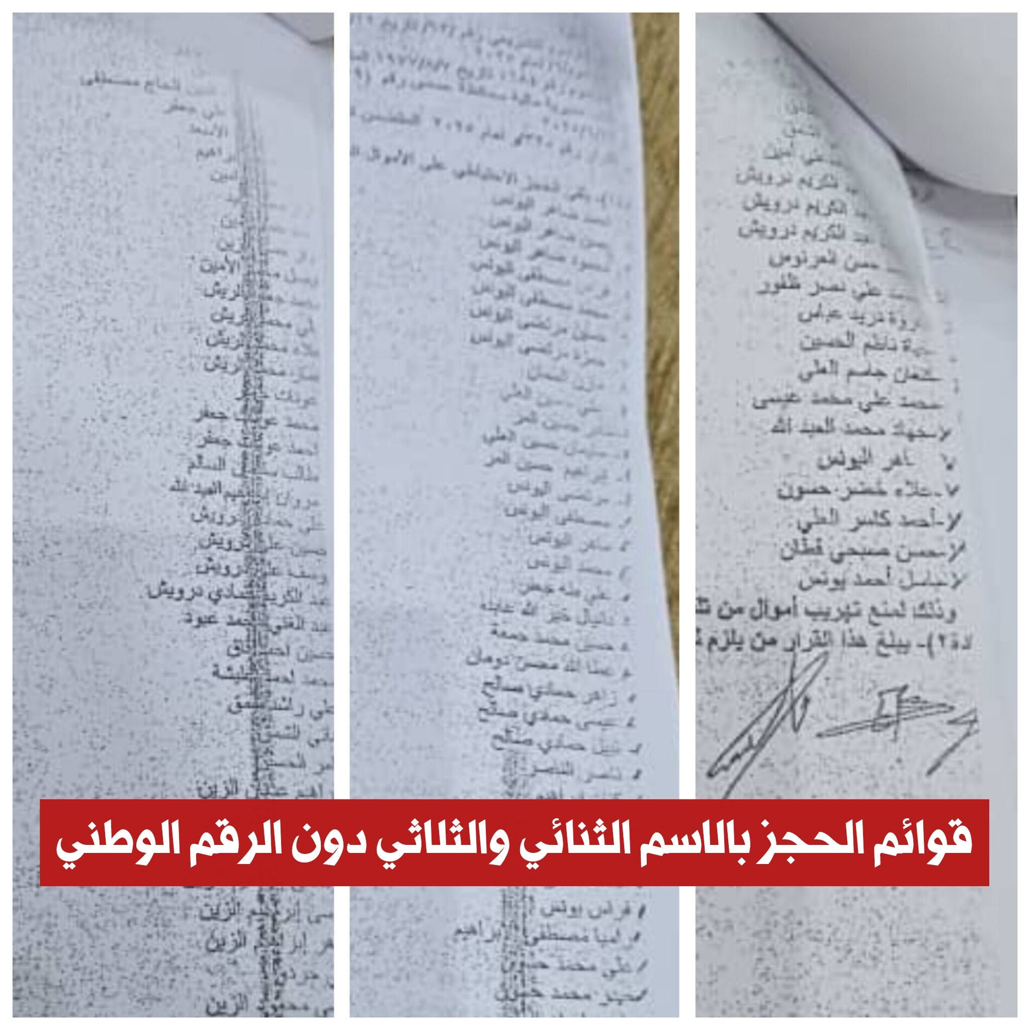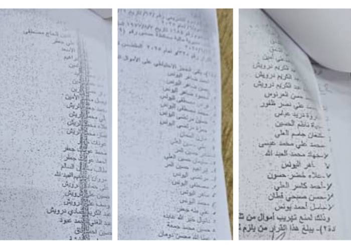 وقالت مصادر محلية وسكان لـ"زمان الوصل" إن وزارة المالية أصدرت مؤخراً قوائم تضم مئات الأسماء لمواطنين تقرر الحجز على أملاكهم بتهم تتعلق بدعم النظام البائد، إلا أن هذه القوائم أُرسلت بالاسم الثنائي أو الثلاثي فقط، دون إدراج الرقم الوطني أو اسم الأم أو المواليد.