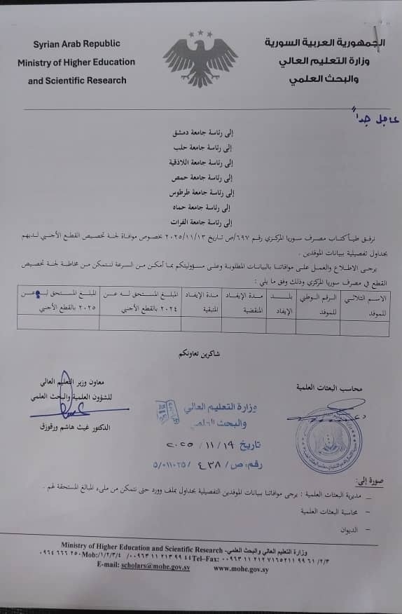 ​في تشرين الثاني من العام الماضي، استبشر الموفدون خيراً بطلب الوزارة قوائم مفصلة من الجامعات تشمل الأسماء، الأرقام الوطنية، والمدد الزمنية المتبقية للإيفاد. وبالفعل، أُنجزت المهمة وأُرسلت البيانات.