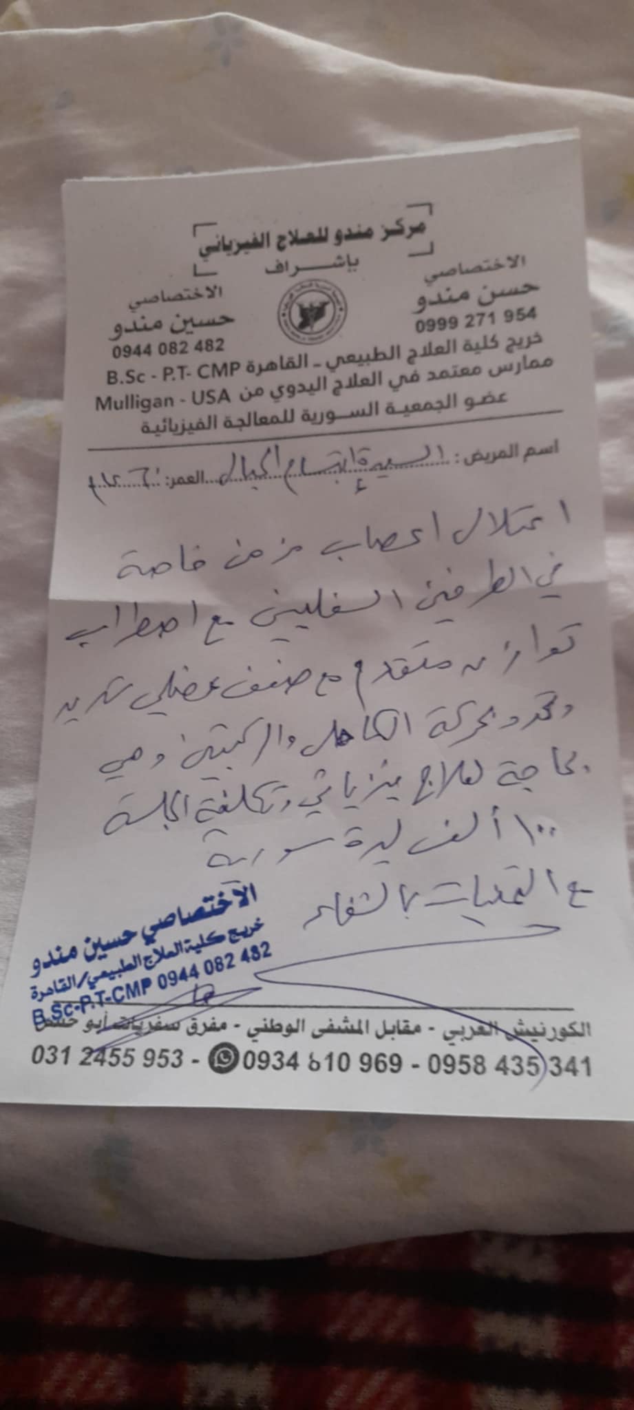 ووفق تقرير طبي اطّلعت عليه "زمان الوصل"، تعاني ابتسام من اعتلال أعصاب مزمن يتركّز بشكل خاص في الطرفين السفليين، ويترافق مع اضطراب واضح في التوازن، وضعف عضلي شديد، إضافة إلى محدودية في حركة الكاحلين والركبتين، ما يزيد من اعتمادها على الرعاية الطبية والدعم اليومي.