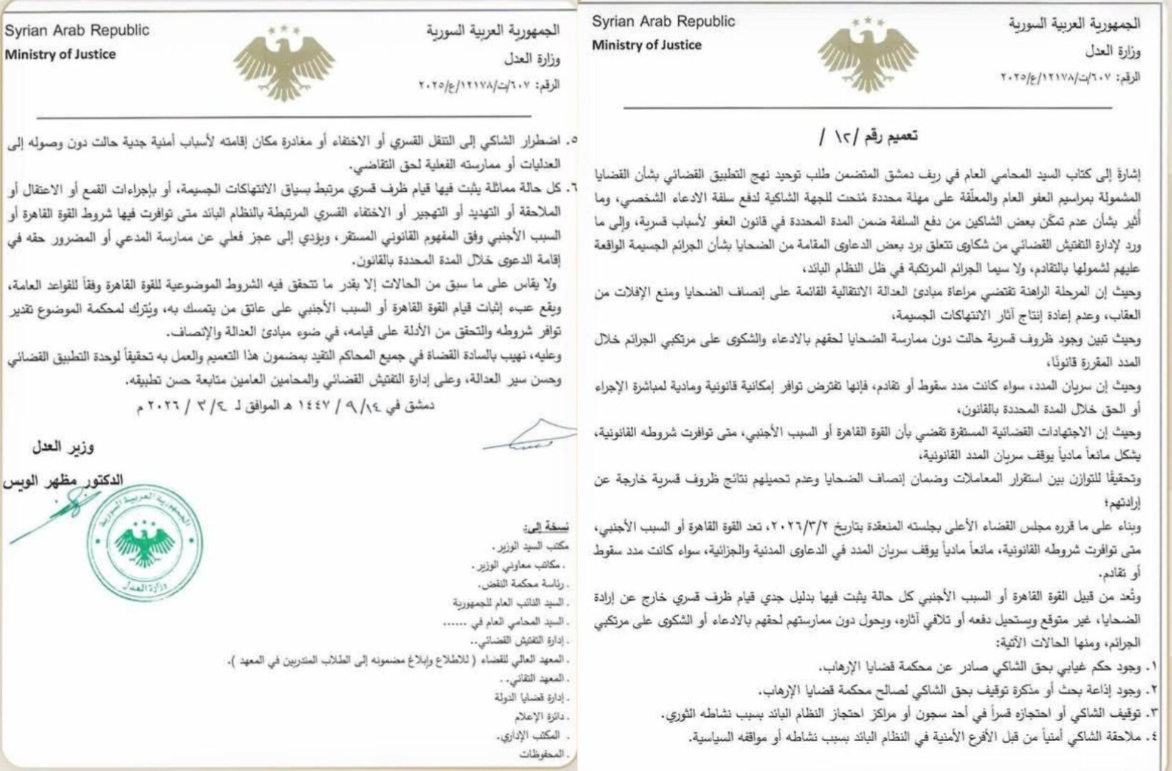 أصدر وزير العدل في الجمهورية العربية السورية، الدكتور مظهر الويس، التعميم رقم (12) لعام 2026، والذي يقضي بوقف سريان مُدد التقادم والسقوط في الدعاوى المدنية والجزائية للمتضررين الذين منعتهم ظروف قسرية من ممارسة حقوقهم القانونية خلال فترة "النظام البائد".