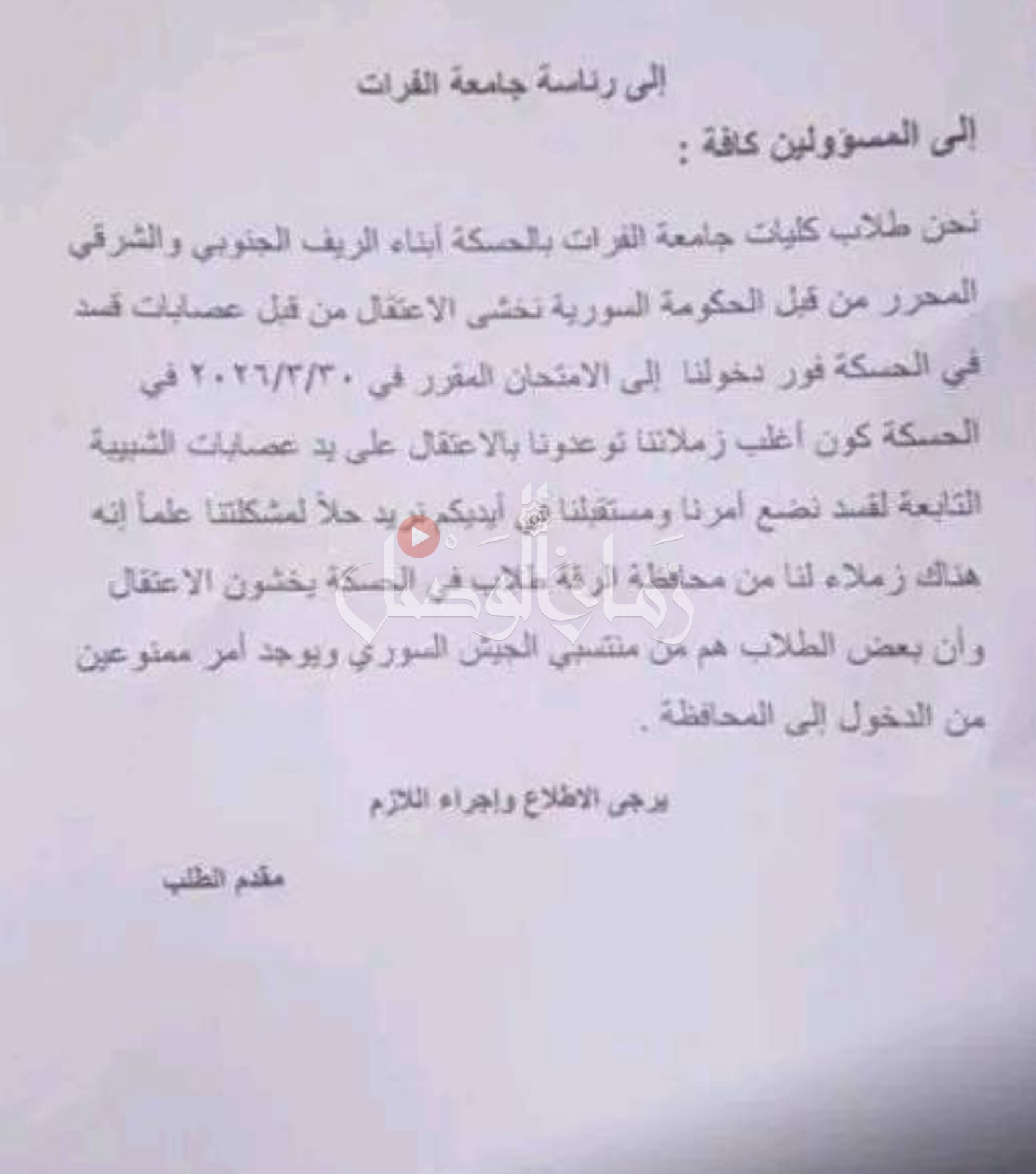 نقل طلاب من الأرياف في دير الزور والرقة والحسكة مناشدة عاجلة عبر "زمان الوصل"، محذرين من المخاطر الأمنية التي تتربص بهم أثناء توجههم لتقديم امتحاناتهم الجامعية في مدينة الحسكة (جامعة الفرات).