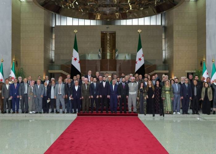 استقبل الرئيس أحمد الشرع، في قصر الشعب بدمشق يوم أمس، وفدًا من أبناء المكوّن الكردي، وذلك بمناسبة عيد الفطر المبارك وعيد النيروز، بحضور محافظي حلب والرقة والحسكة، إلى جانب المبعوث الرئاسي المكلّف بمتابعة تنفيذ اتفاق 29 كانون الثاني مع "قسد".