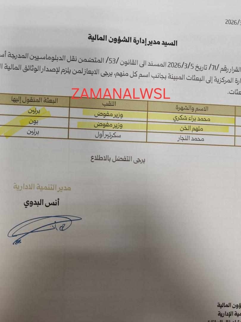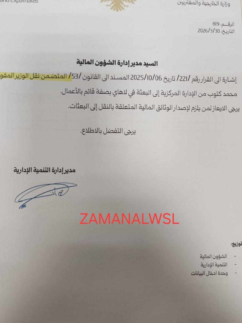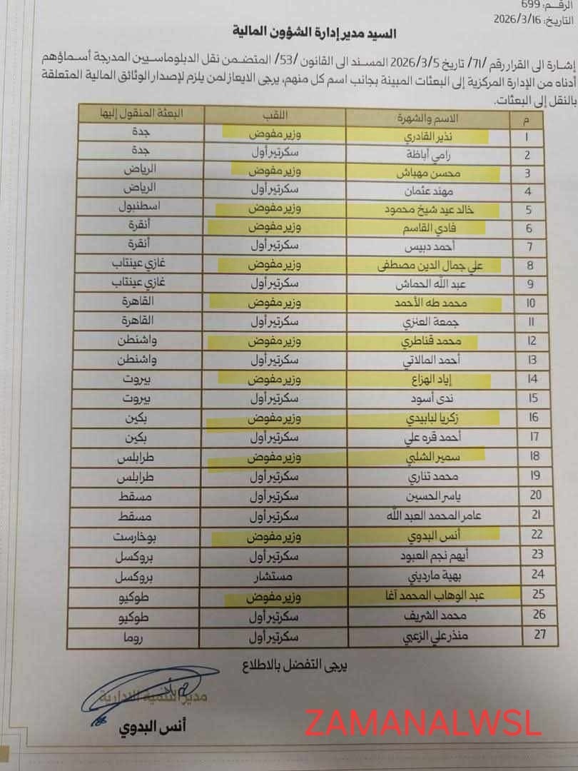 أظهرت صور وثائق داخلية صادرة عن وزارة الخارجية والمغتربين، صدور قرارات بنقل وتعيين 31 كادراً دبلوماسياً إلى بعثات خارجية برتب عليا، وسط تساؤلات حول الأسانيد القانونية المستخدمة ومعايير التدرج الوظيفي المتبعة والشهادات الجامعية.
