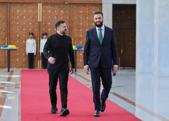 استقبل الرئيس السوري أحمد الشرع في قصر الشعب بدمشق، الرئيس الأوكراني فولوديمير زيلينسكي، بحضور وفد وزاري من البلدين، ومشاركة وزير الخارجية التركي هاكان فيدان.