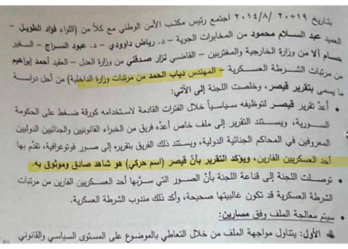 وتُظهر وثيقة مسربة تعود إلى آب/أغسطس 2014 أن اسمه ورد ضمن اجتماع أمني جمع ضباطًا ومسؤولين من أجهزة الاستخبارات ووزارات الداخلية والخارجية والعدل، وكان مخصَّصًا لوضع خطة للتعامل مع ملف "قيصر".