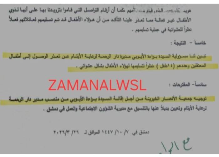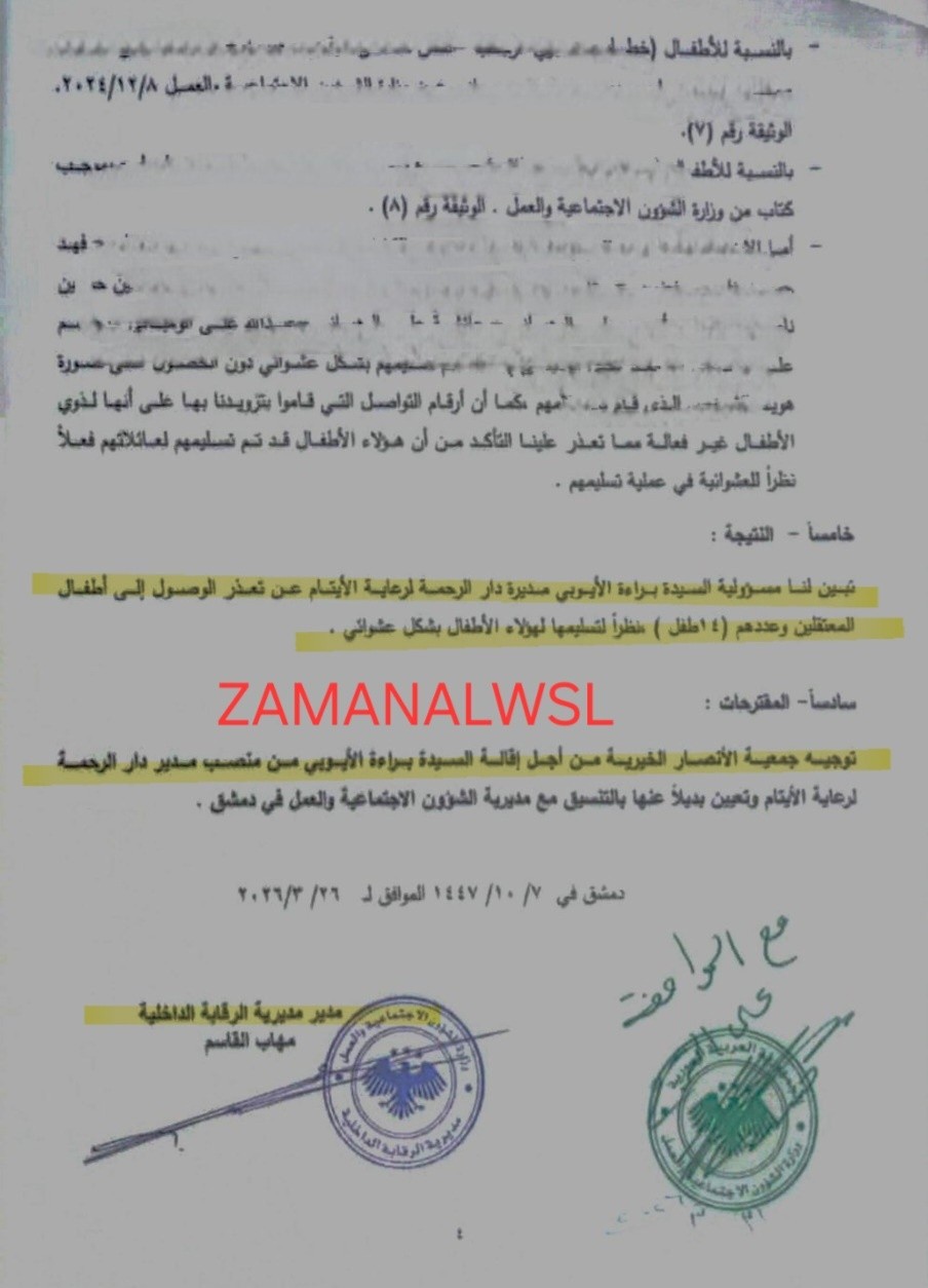 أقرت مديرة الرقابة الداخلية في وزارة الشؤون الاجتماعية والعمل بمسؤولية مديرة دار الرحمة براءة الأيوبي عن فقدان 14 طفلاً أغلبهم من أبناء المعتقلين بعد تسليمهم بشكل عشوائي، وطالبت الرقابة بكف يدها عن الدار دون التوصية بأي إجراء جنائي بحقها، بحسب كتاب صدر في 26 الشهر الماضي.
