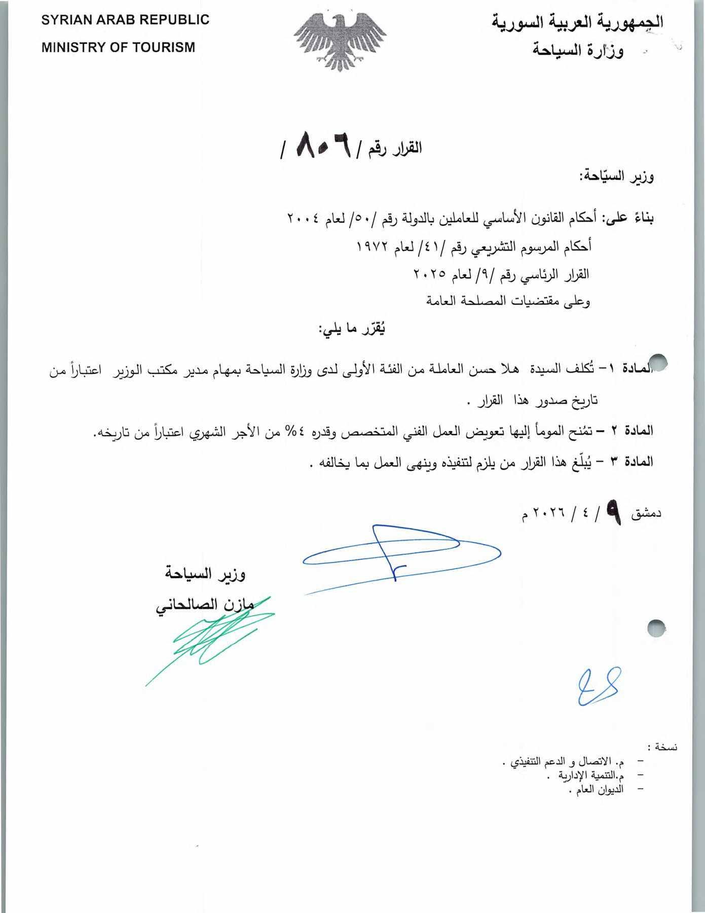أصدر وزير السياحة في الحكومة الحالية، مازن الصالحاني، قراراً بتكليف "هلا حسن" بمهام مدير مكتبه، ومنحها تعويض عمل فني بنسبة 4% من أجرها الشهري.