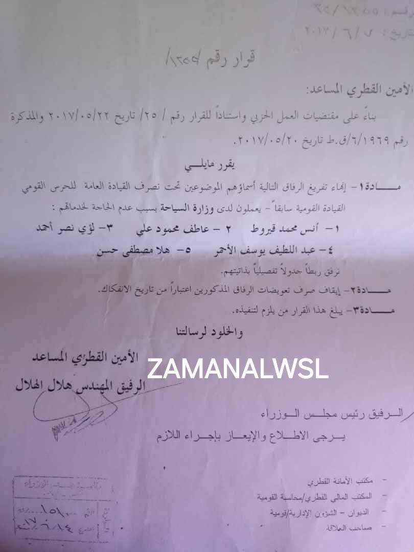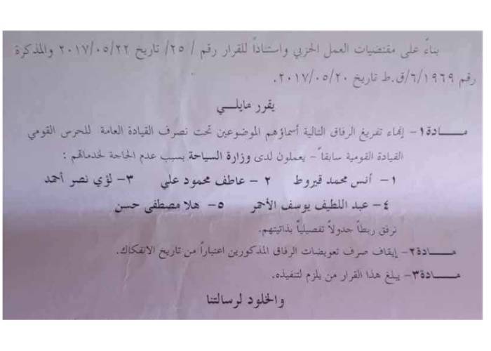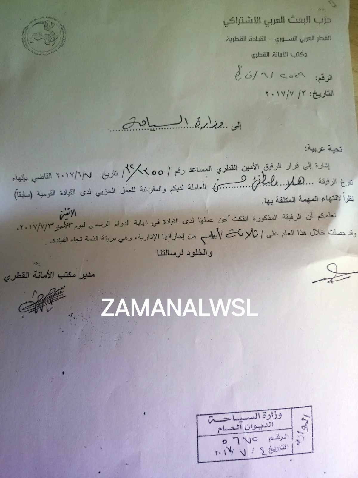 تكشف الوثائق أن "الرفيقة" المكلفة حديثاً ليست وجهاً جديداً، بل هي أحد الكوادر التي اعتمد عليها "النظام البائد" لسنوات. ففي عام 2017، كانت "هلا حسن" من ضمن قائمة "الرفاق" المفرغين للعمل الحزبي لدى ما كان يسمى "القيادة القومية"، قبل أن يتم إنهاء تفرغها وإعادتها لوزارة السياحة بسبب "عدم الحاجة لخدماتها" آنذاك... في الحرس القومي.