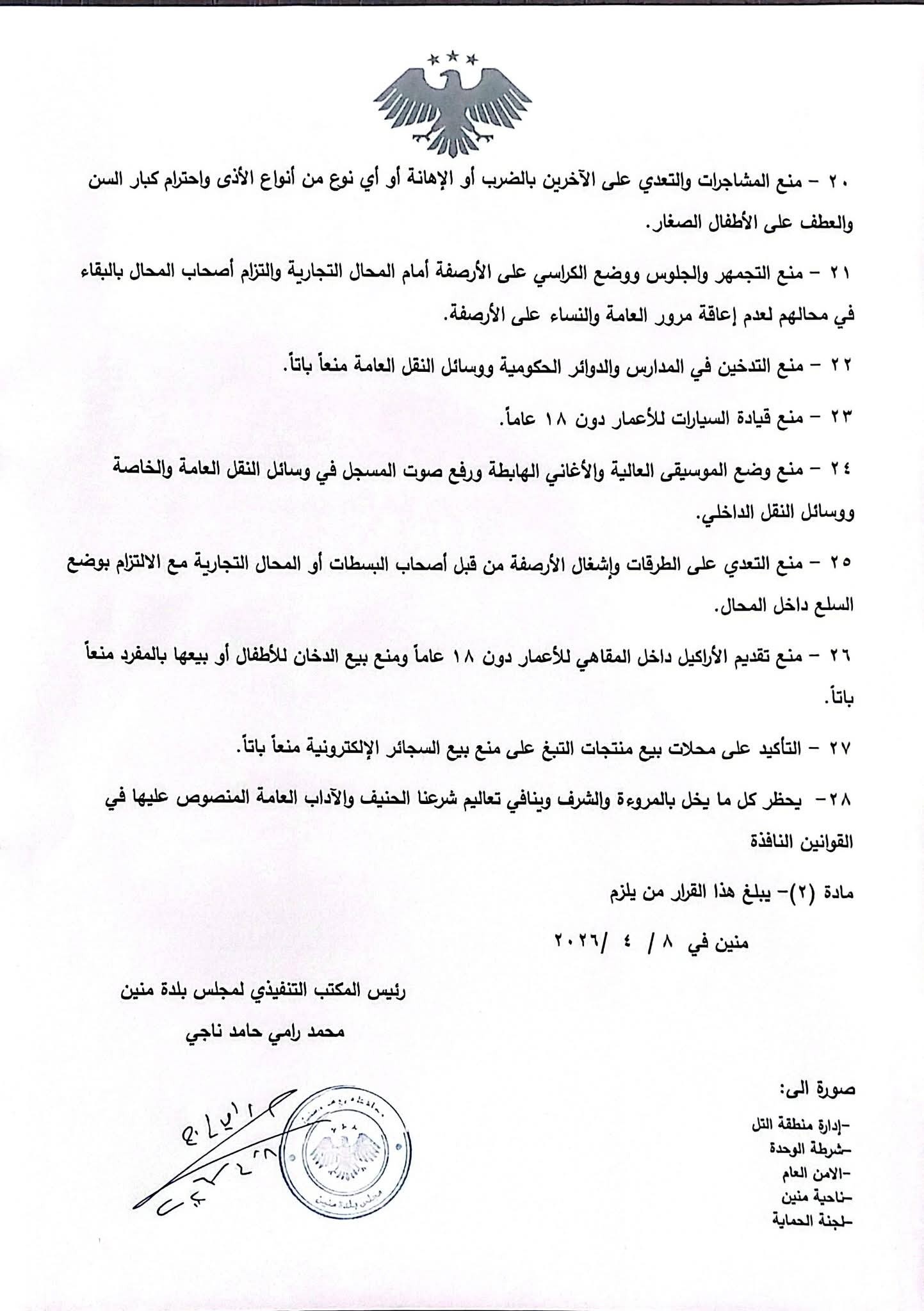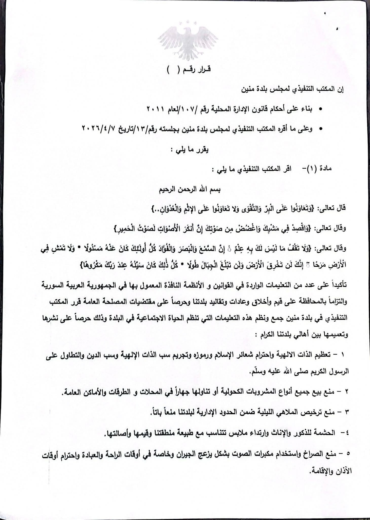 أصدرت بلدية منين بريف دمشق قراراً يمنع بيع المشروبات الكحولية وتراخيص الملاهي الليلية، ويفرض ضوابط على اللباس والسلوك في الأماكن العامة.