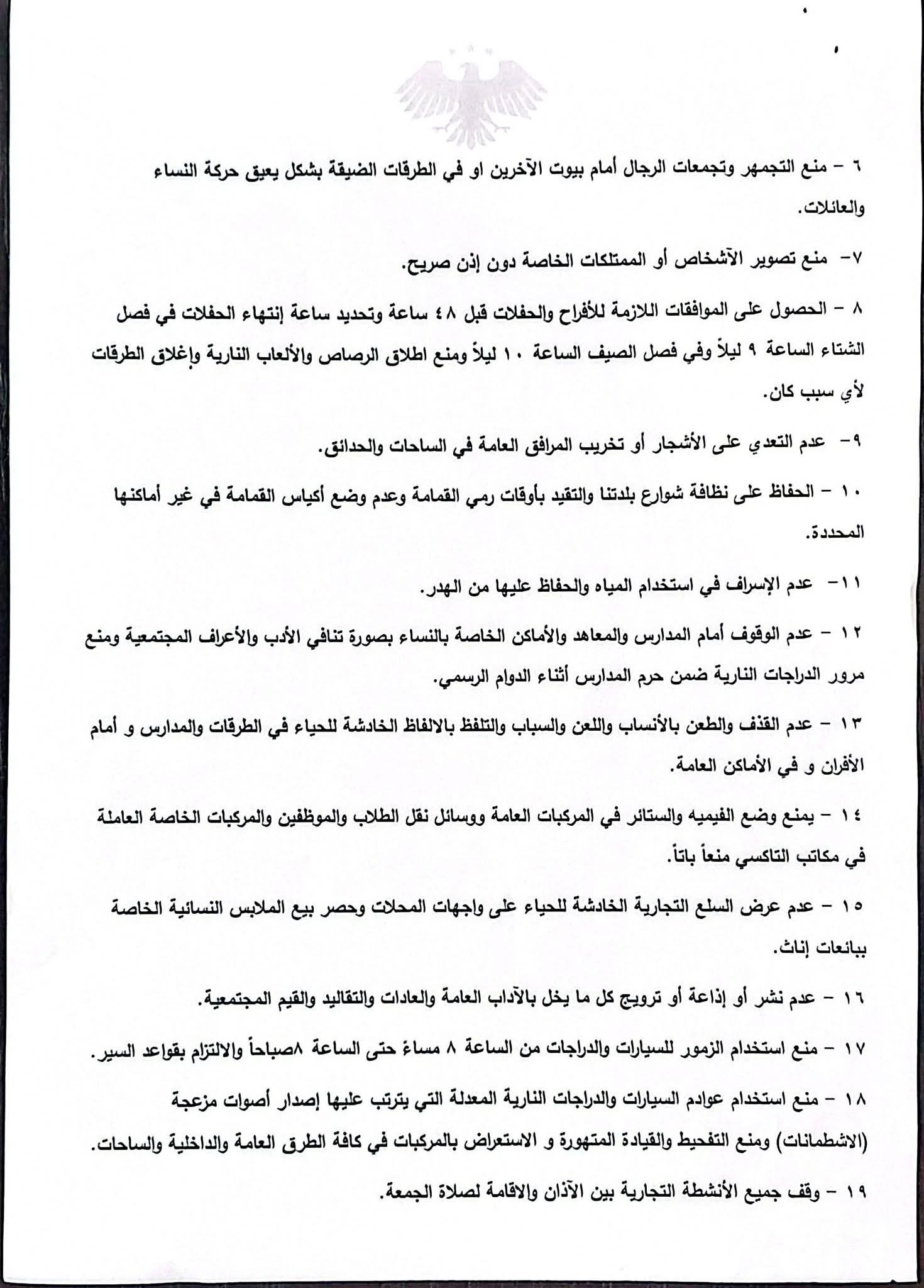 شمل القرار حظر إقامة الحفلات والتجمعات في الطرقات، ومنع التدخين واستخدام مكبرات الصوت، مع تشديد الرقابة على إشغال الأرصفة.