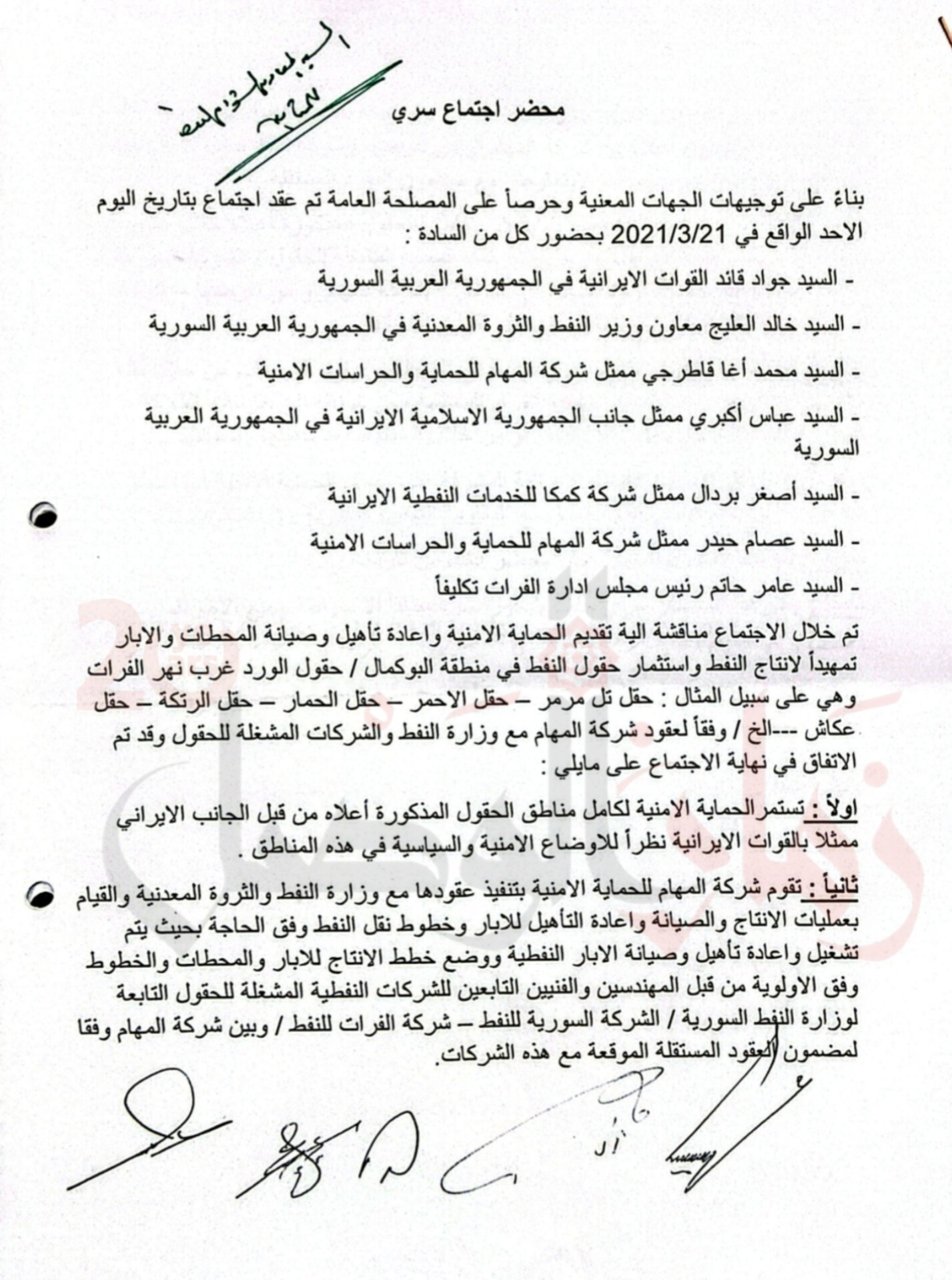 أقر الاجتماع السري منح القوات الإيرانية السيطرة الأمنية الكاملة على حقول النفط غرب الفرات تحت ذريعة الأوضاع السياسية.